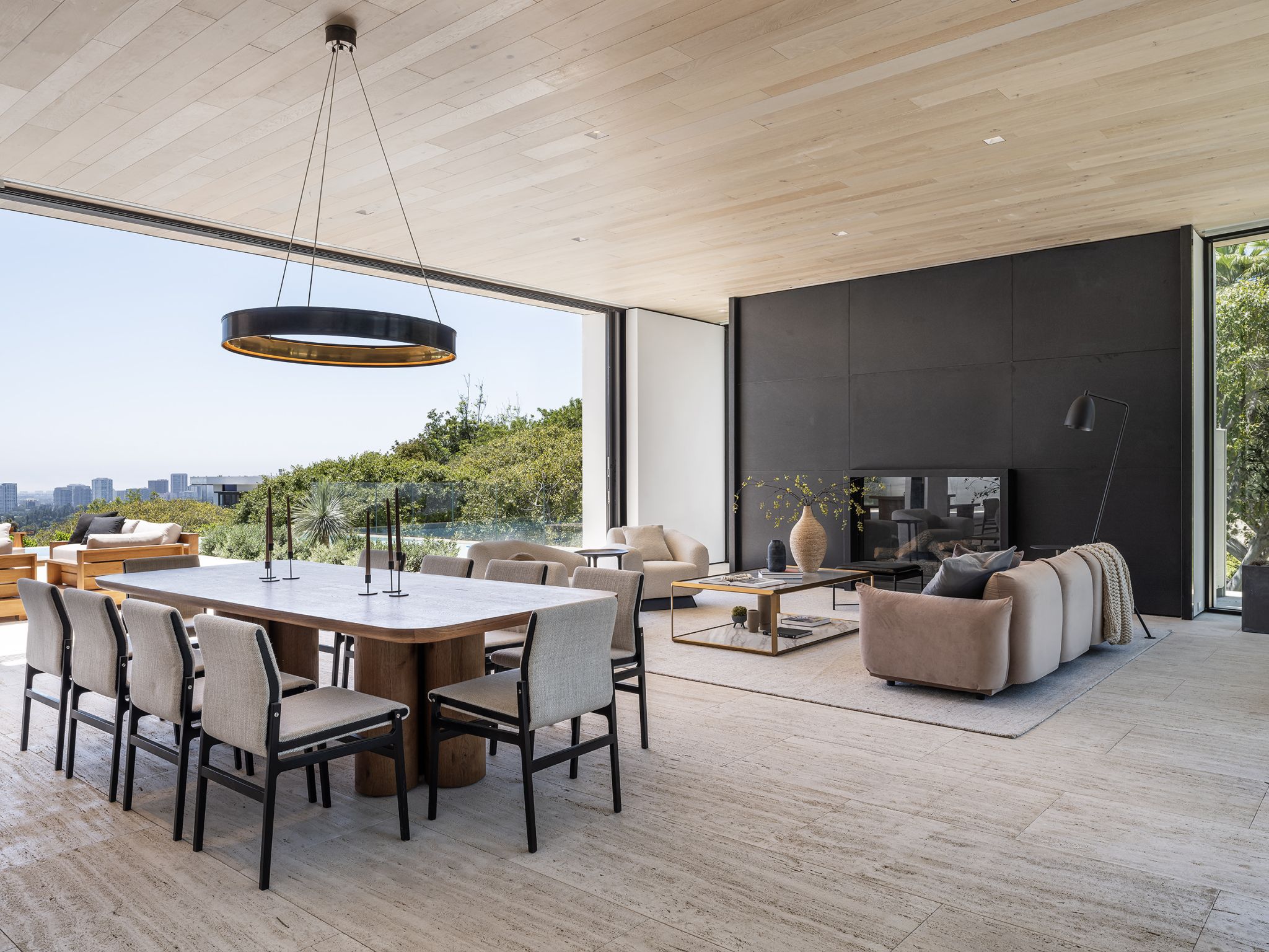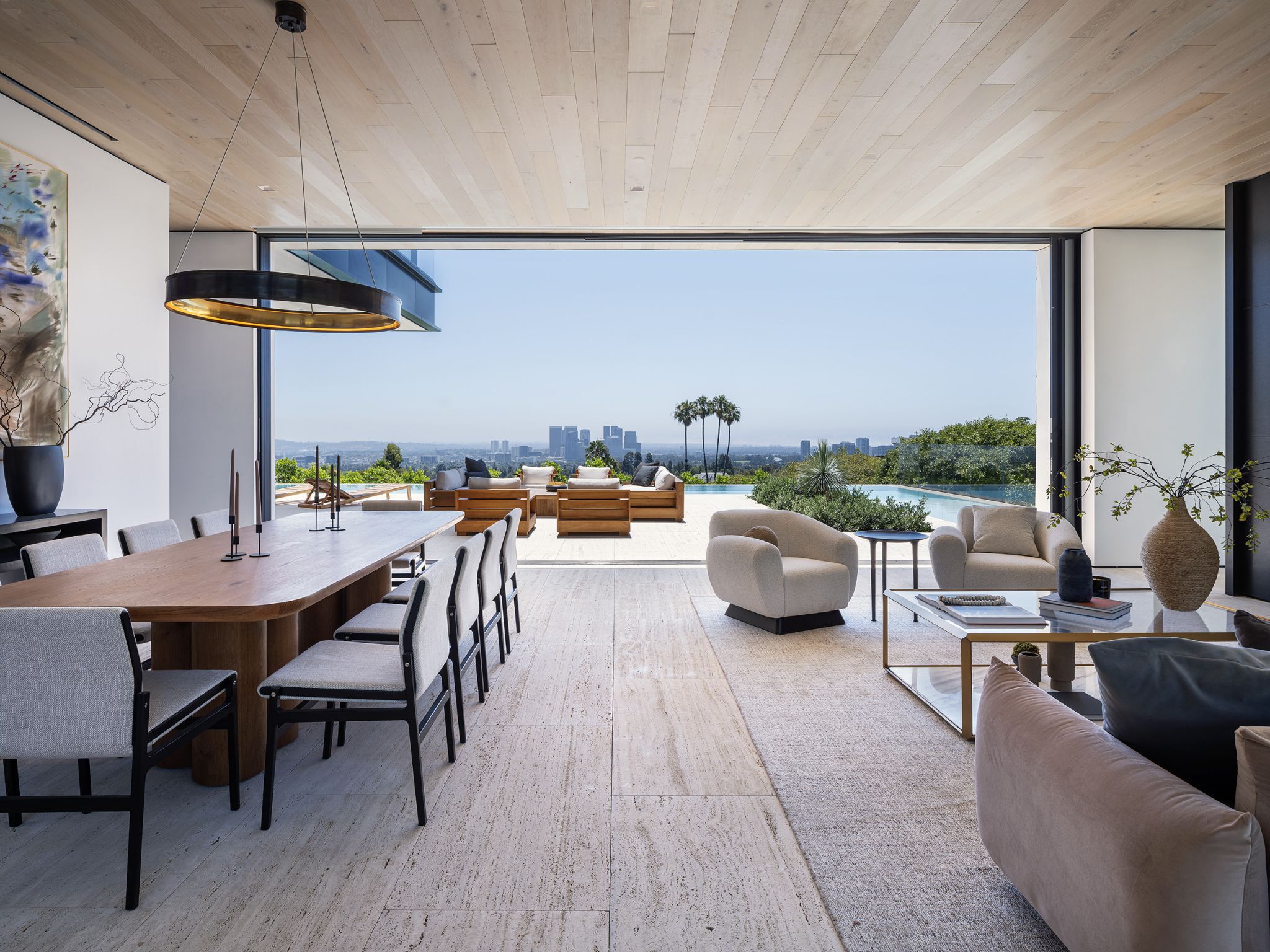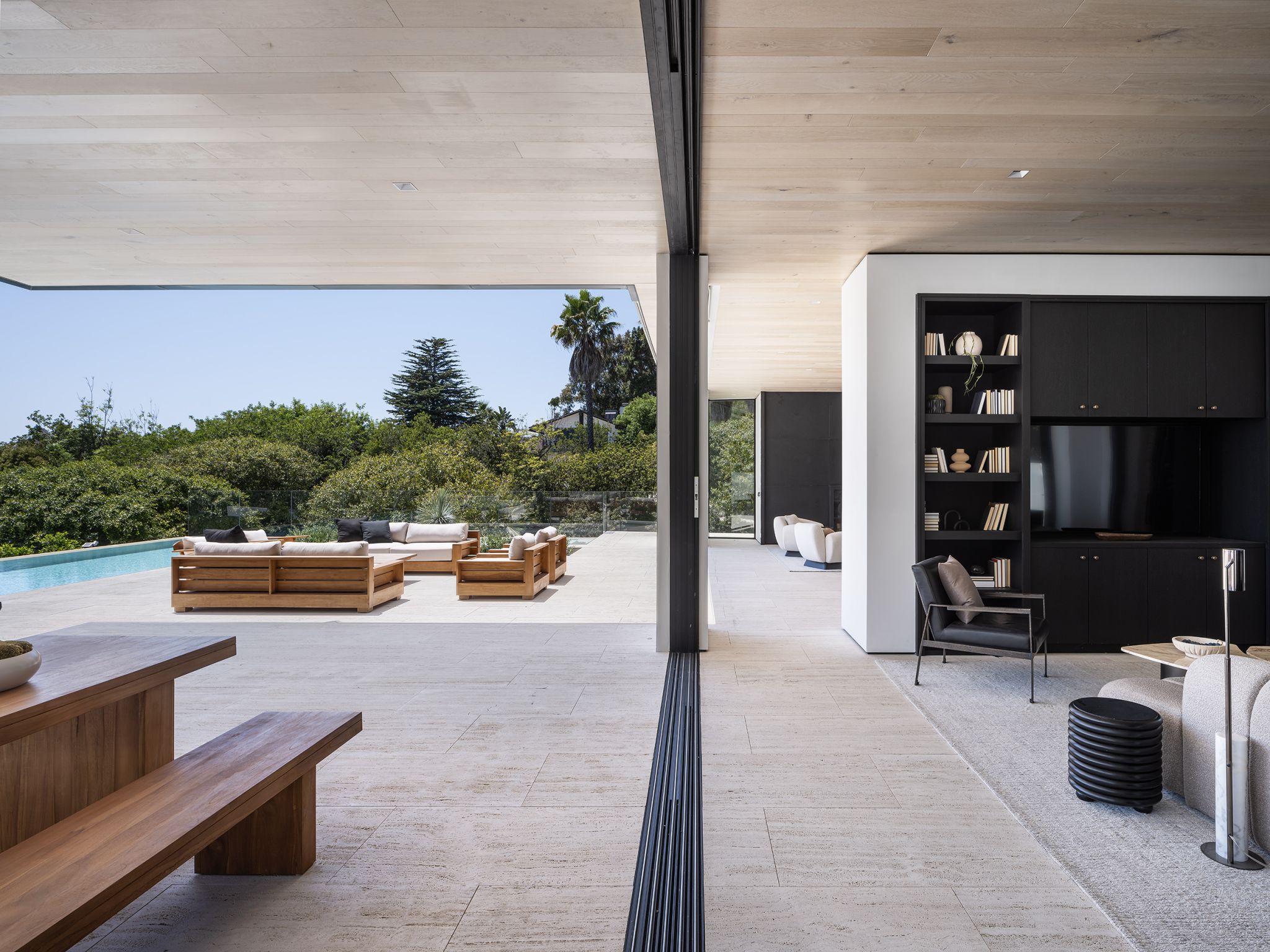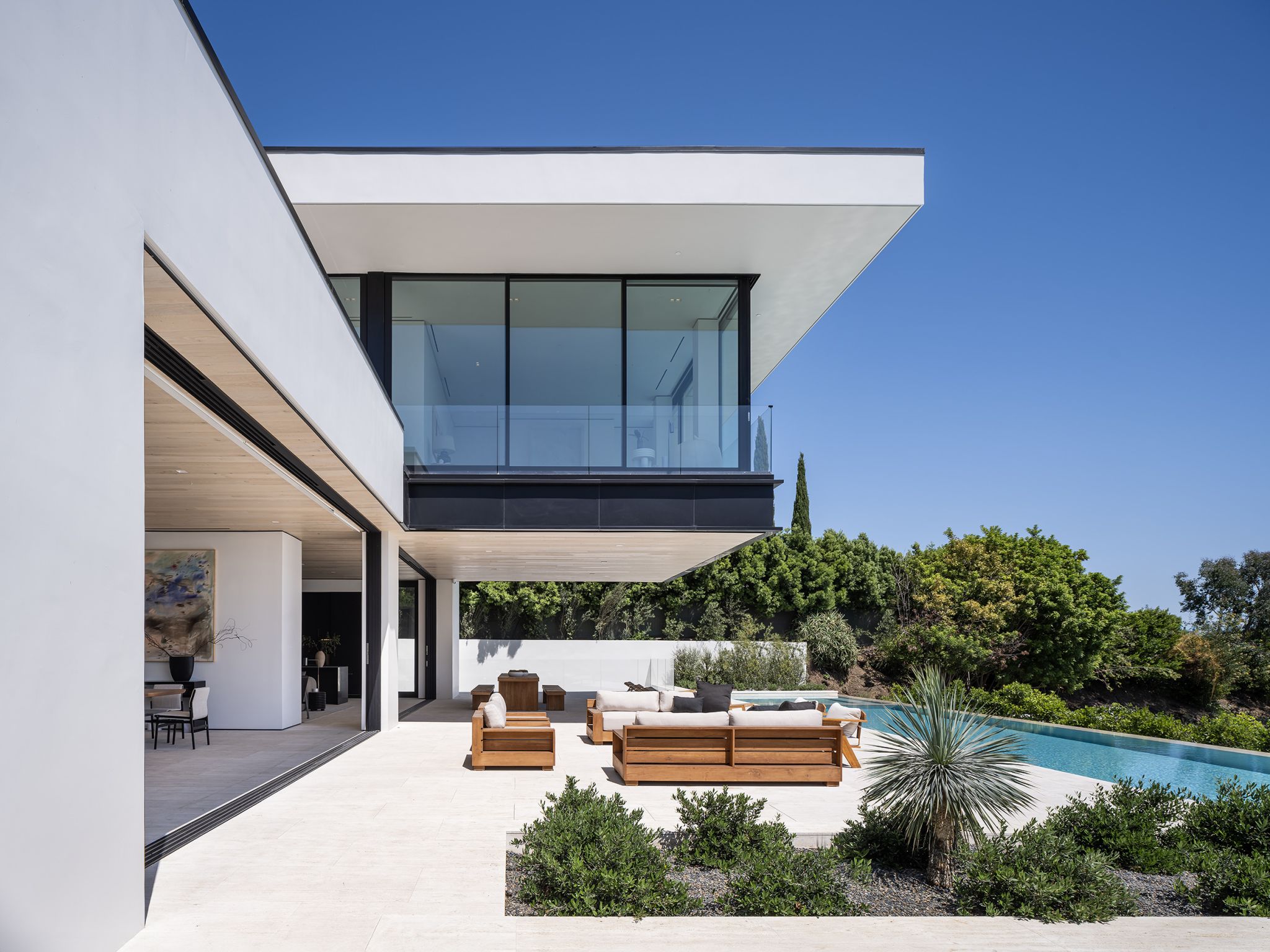 A vertical glazed staircase connects all three levels with the elevator nearby. The Upper level contains the primary bedroom and a guest suite. The most unique feature of the home is the primary bedroom, which is completely cantilevered above the pool terrace below, facing toward the view of the city below. The lack of columns enables a free flow of movement throughout the rear yard while the floating bedroom above provides a considerable amount of shade. The large rear yard pool helps to screen the adjacent residence downslope, while reflecting the city lights at night.