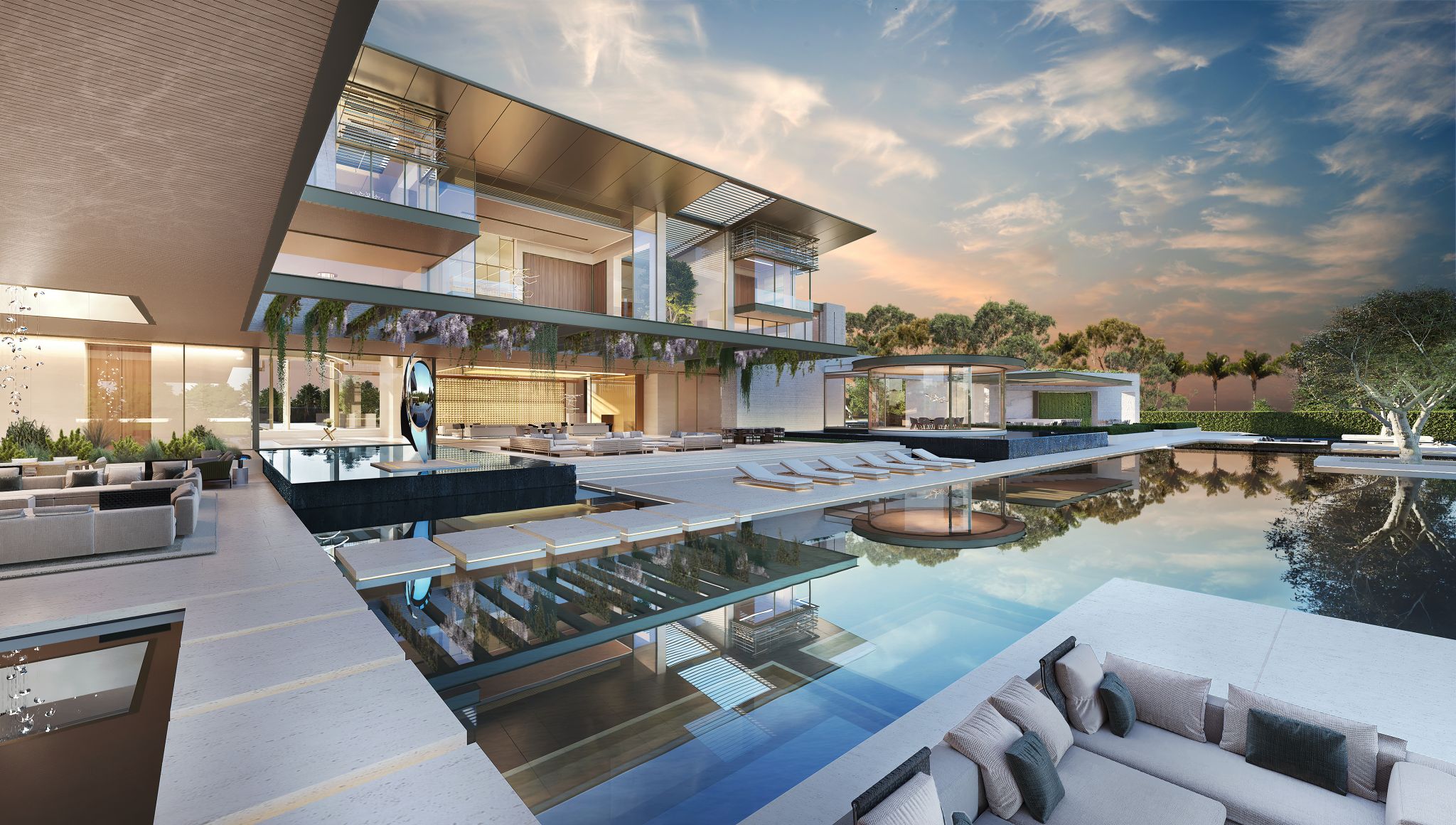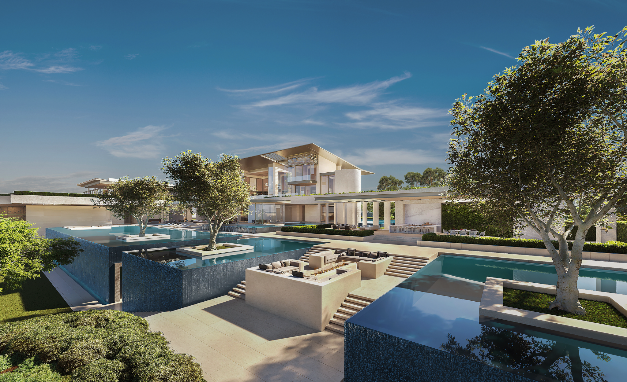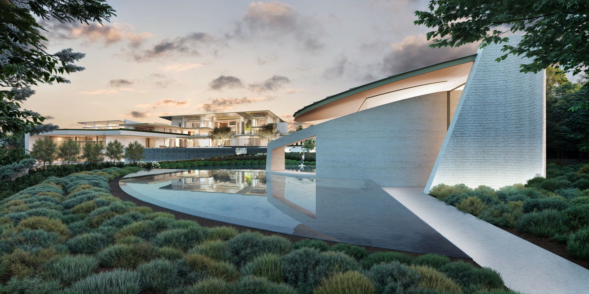 Gardens are laid out with destinations and rest areas in mind, suitable for quiet conversation and contemplation, shaded by trees or adjacent to water elements. The garden at large incorporates both a pavilion for art and a sculptural house of poetry floating on a small pond. The perimeter is heavily screened so that privacy and security is vigorously maintained. The palette for the house is quiet luxury, elegant tones and textures of stone and metals with timeless rich wood accents.