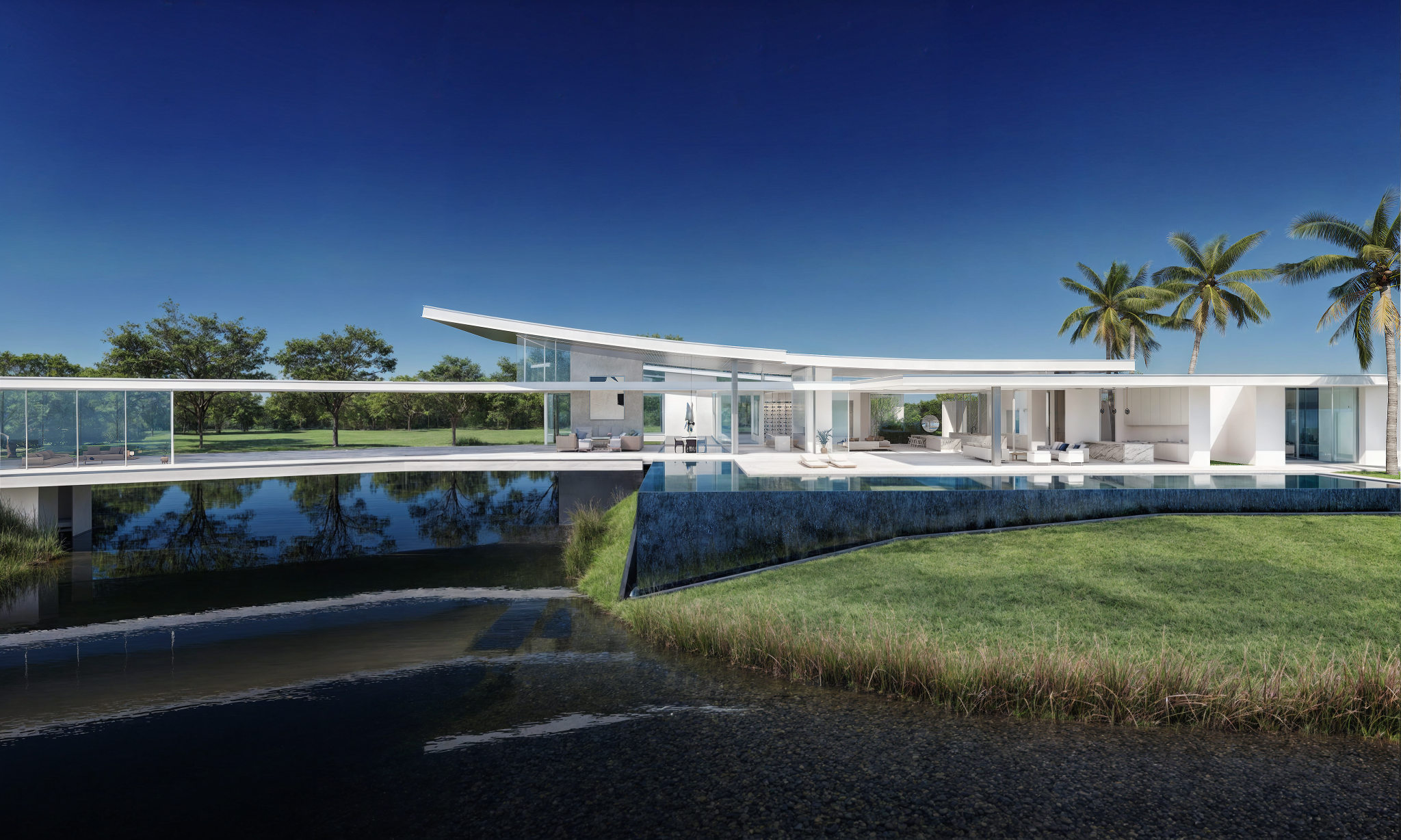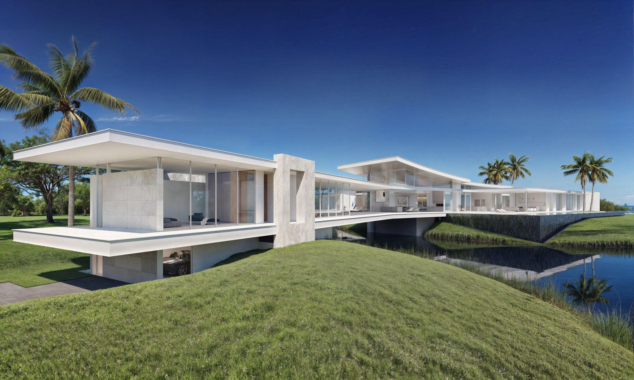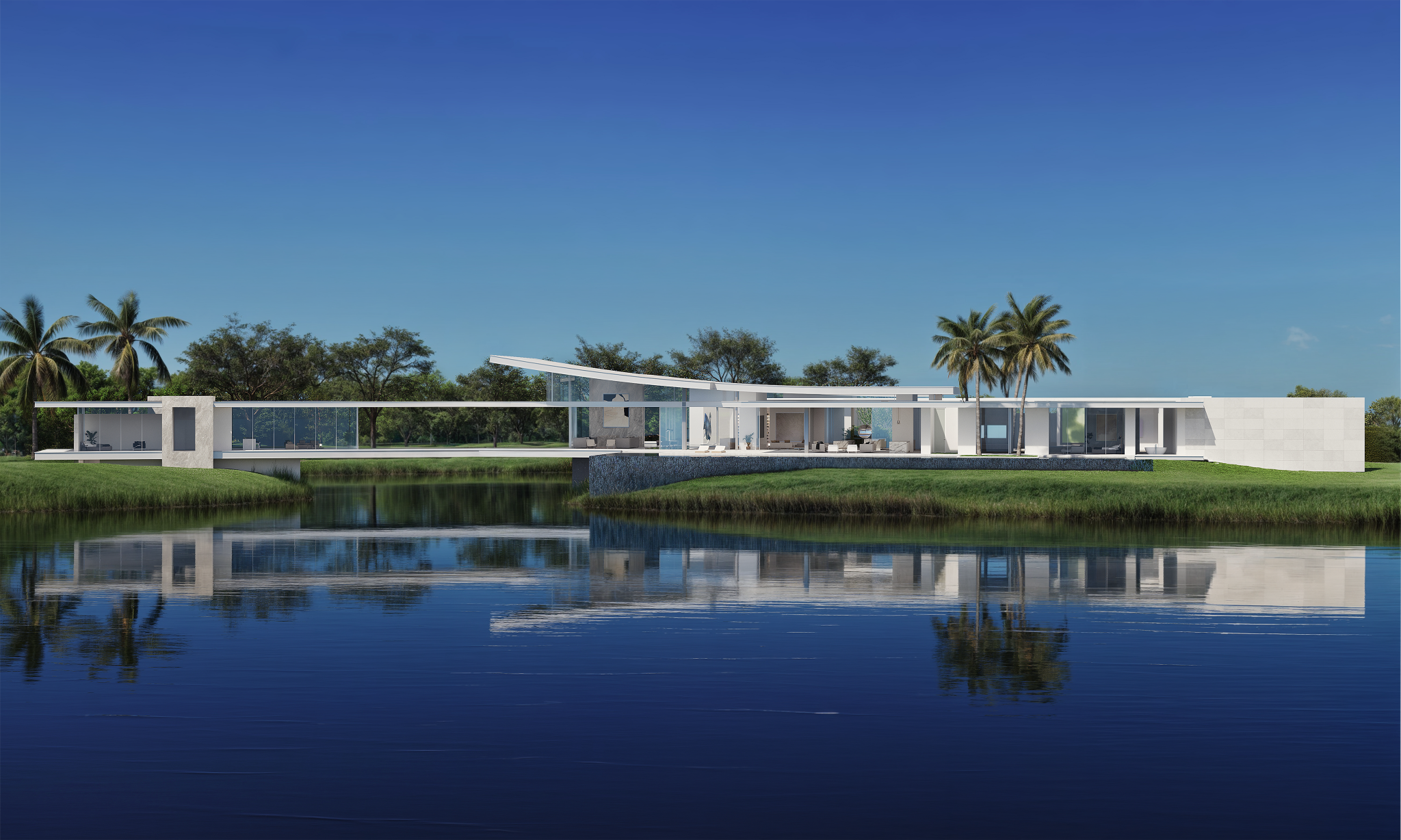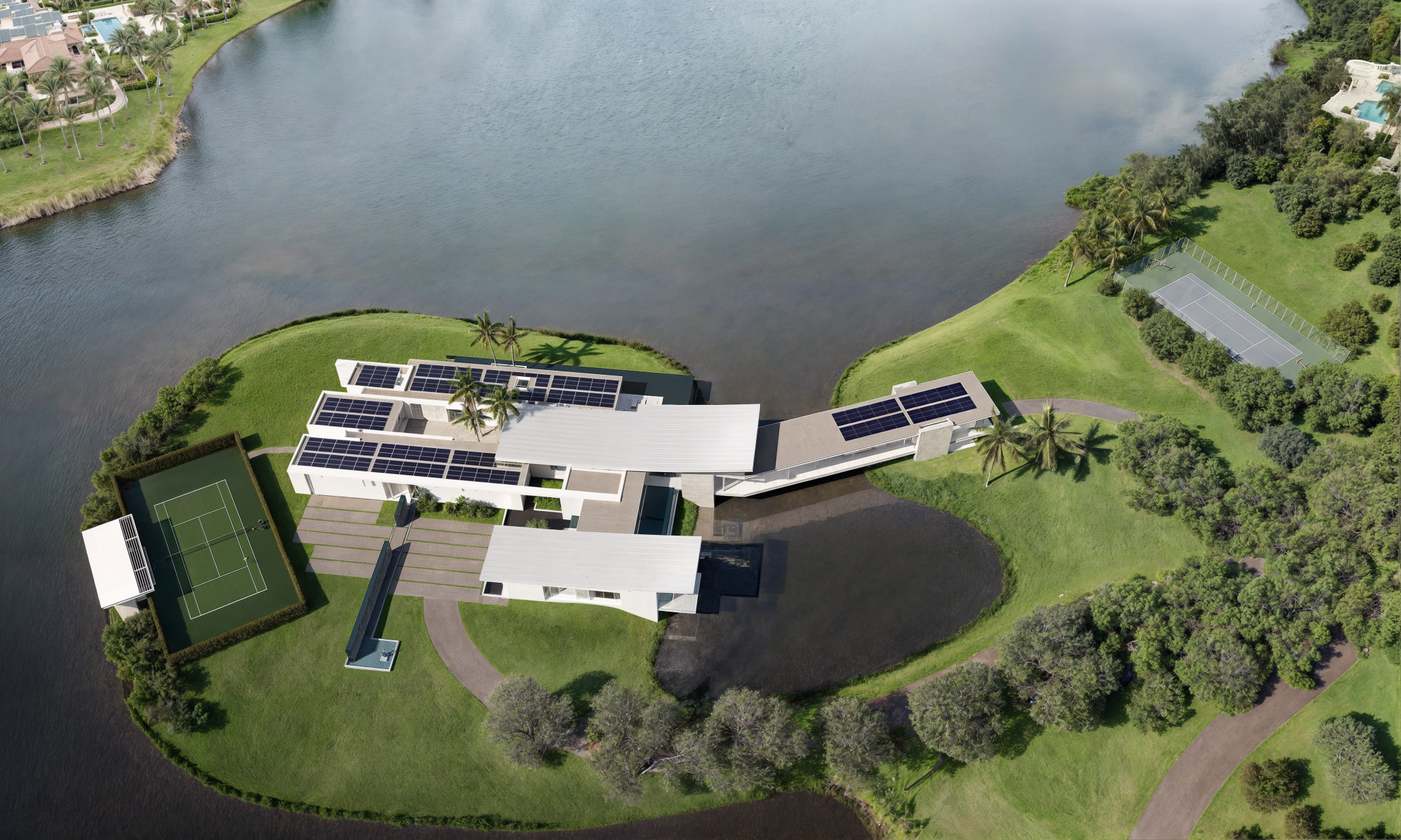 It’s very rare in our field that you get the opportunity to actually build over water since so many lakes and rivers are governed by both state and federal rules and regulations. In this case, our clients had purchased a unique 4 acre parcel, bordering a lake in a private community where the lot is divided into two sections by an inlet and where we actually could imagine a house that floated above the water. The smaller portion of the property to the east of the inlet hosts the guest house, while the larger portion to the west accommodates the main house, a tennis court, and other amenities. An open-air bridge serves as a connecting element, creating an airy space to enjoy the natural surroundings and the evening breezes above the water.