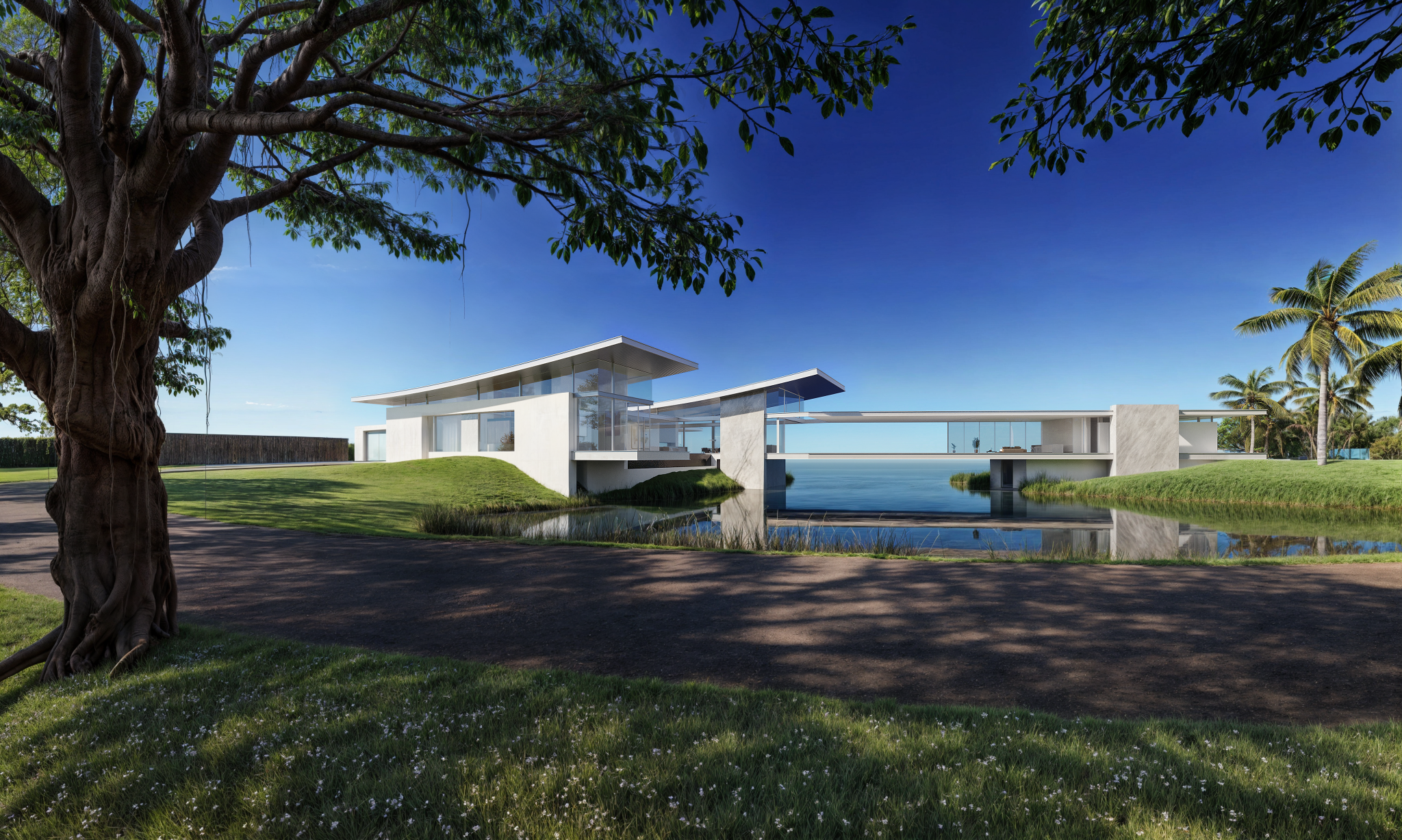The clients’ passion for contemporary art informs the design, with an emphasis on neutral backgrounds (predominantly white walls) to serve as the perfect canvas for their art collection. The house is designed to maximize glazing, allowing ample natural light to flood the interior and highlight the artwork while offering unobstructed views of the lake. The design concept integrates art, nature, and living space into a harmonious and visually striking lakeside retreat, creating a home that feels both expansive and intimately connected to the surrounding environment.