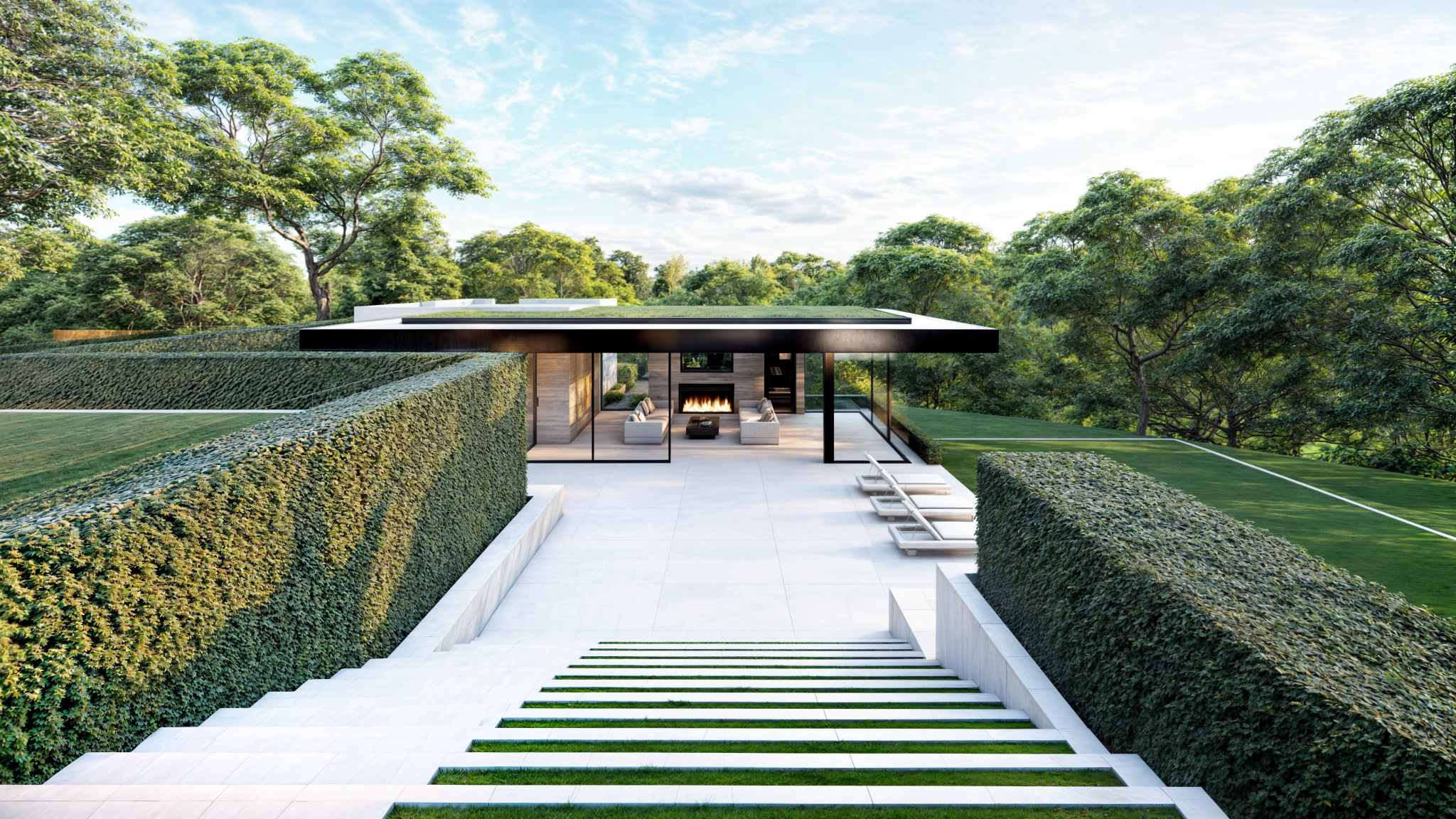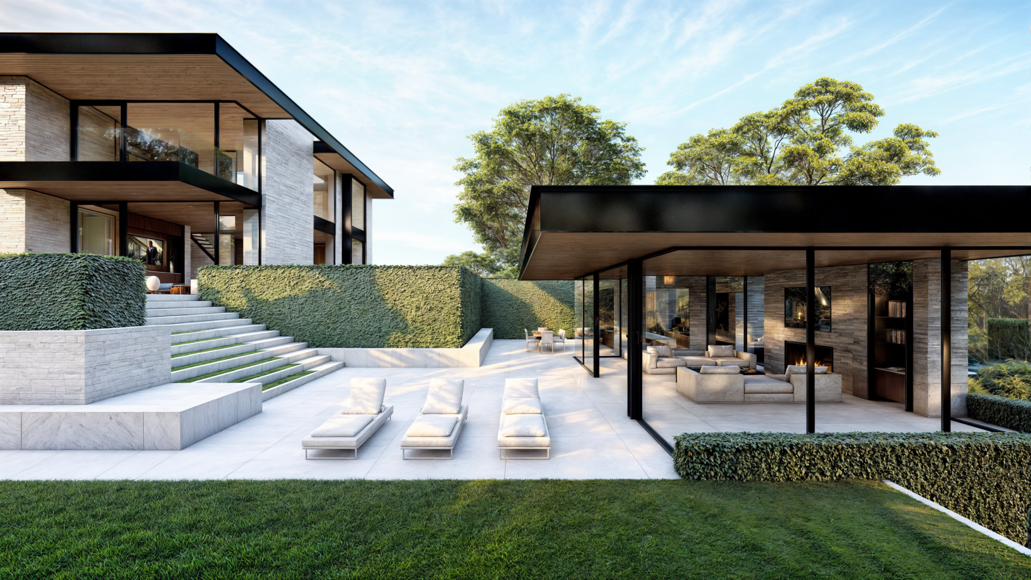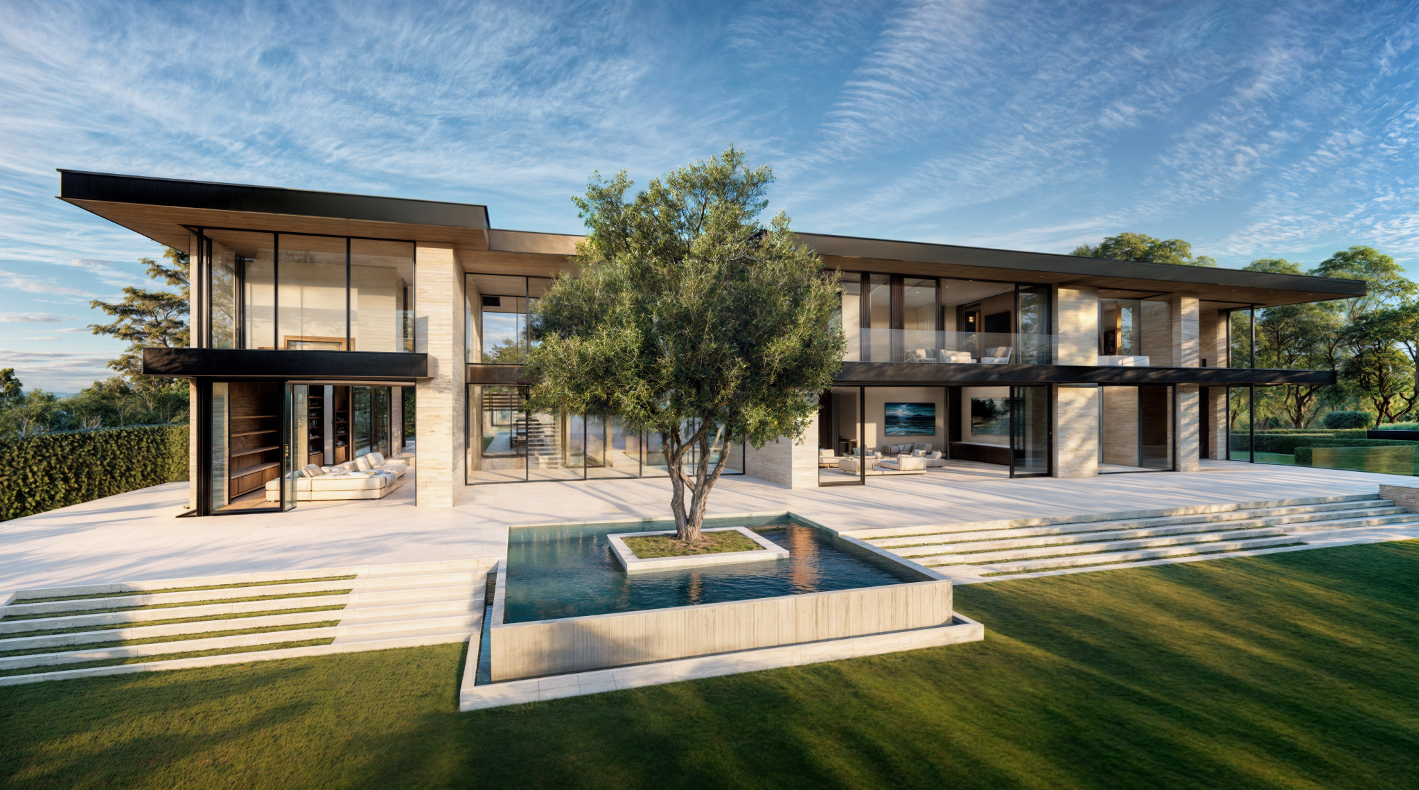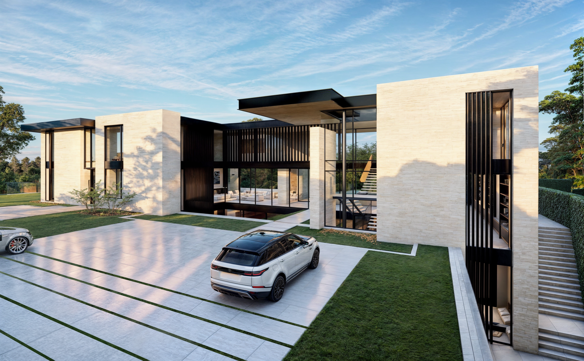 Working with beautiful site overlooking Wentworth golf course and surrounded by mature trees, the client desired a house that would suit his growing family and incorporate some of the California lifestyle he had grown to love while living in Los Angeles. The design of the home is for approximately 12,000 square feet in addition to a pool and guest house. The main house would consist of two stories over basement but make allowances for the different weather conditions in Southern England. Due to local planning codes, a substantial portion of the home would need to be in the basement. In addition, the client wanted a large garage to accommodate a collection of cars with the ability to display some of them on a rotating car turn table.