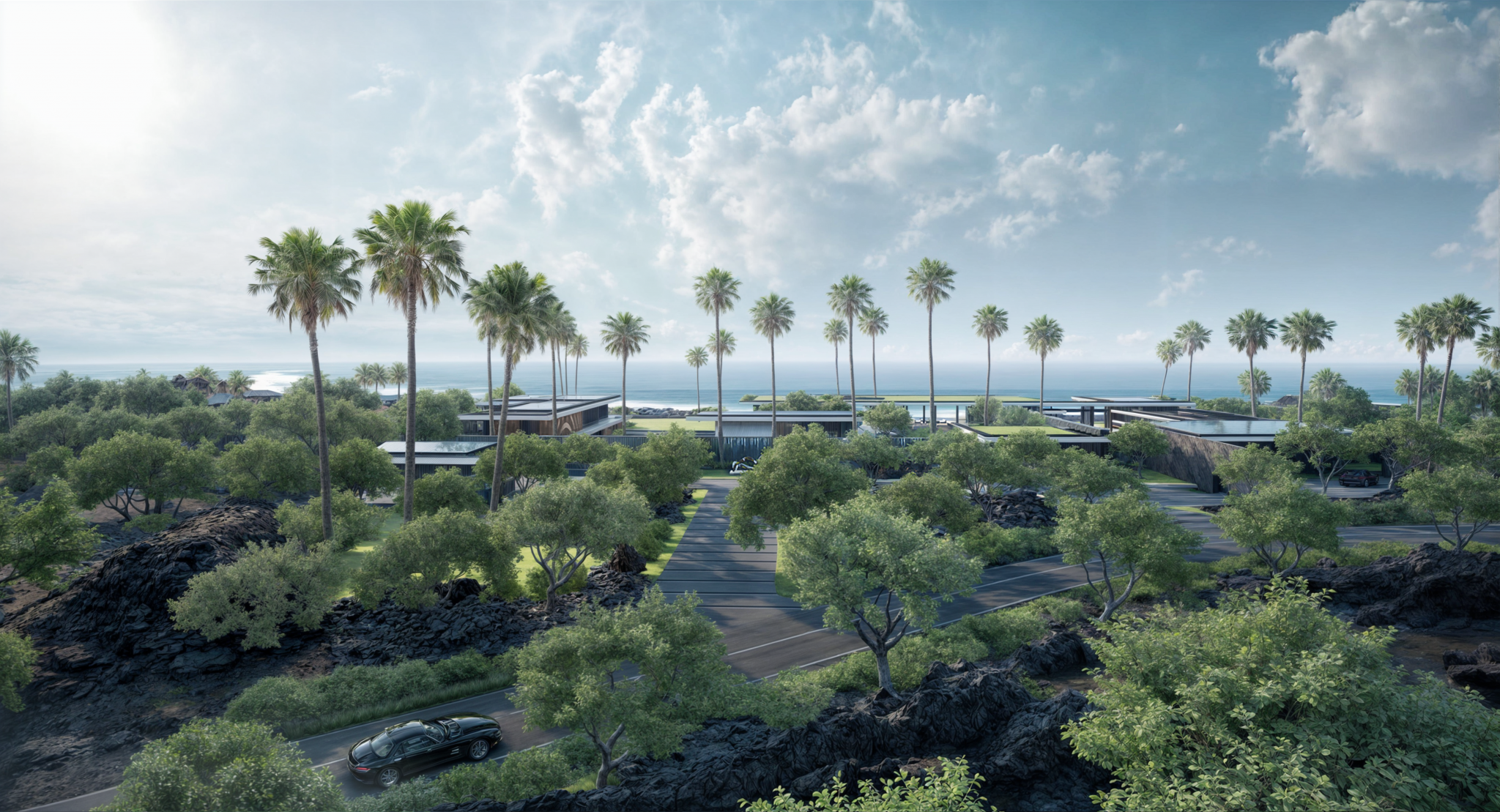 This plot is in a community overlooking the pacific ocean on the big island of Hawaii. The entire development sits on a lava field and the site is ocean front. Colors are intense with the blue of the ocean contrasting with the intense vibrancy of vegetation and the blackness of the volcanic rock to create a surreal visual environment. The backdrop of the volcanoes is just impressive as the view of the sea and Maui across the channel. The client was inspired by the site and wanted to create something that was more than just a home, truly related to the landscape in a poetic way, with themes that occur in the landscape should be repeated within the structure.