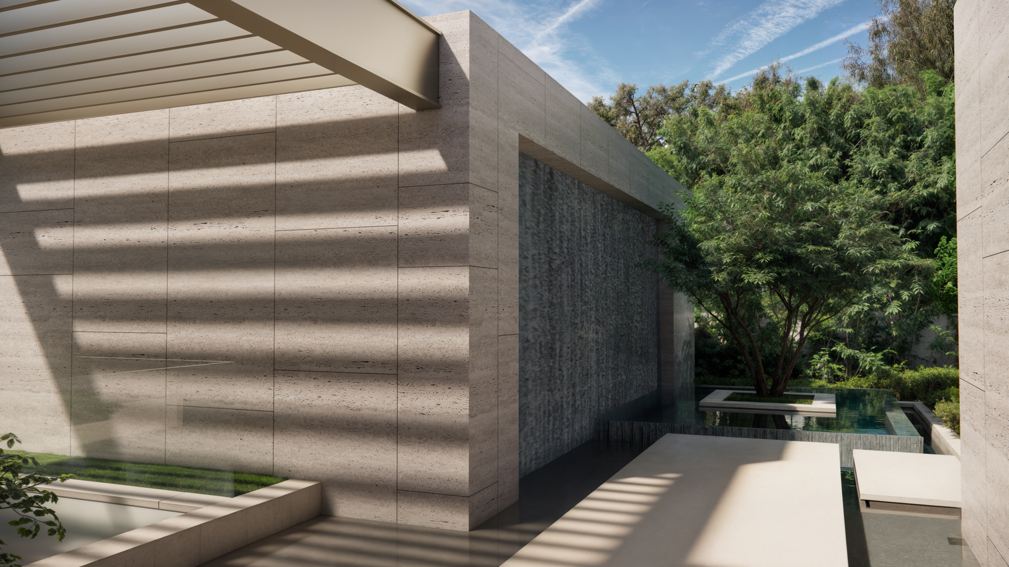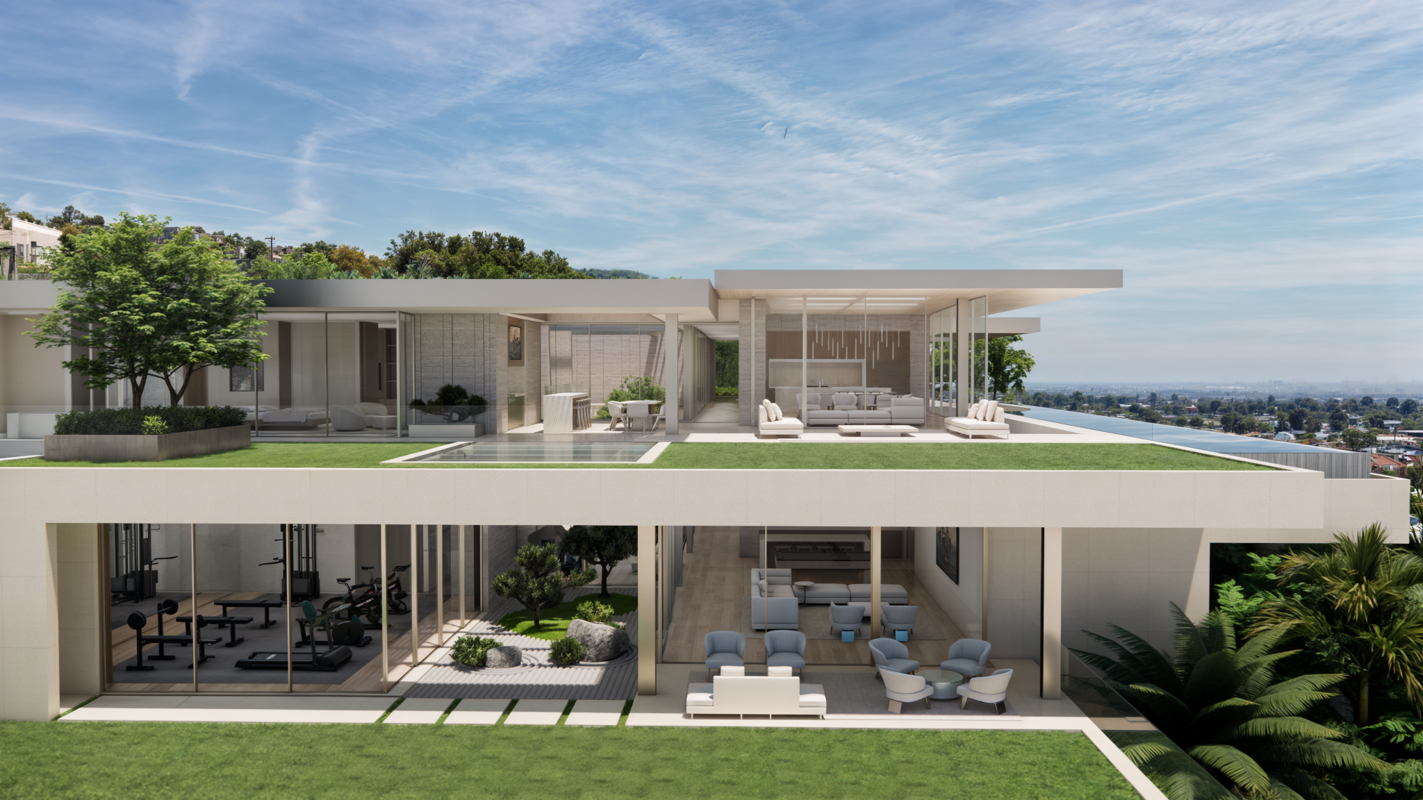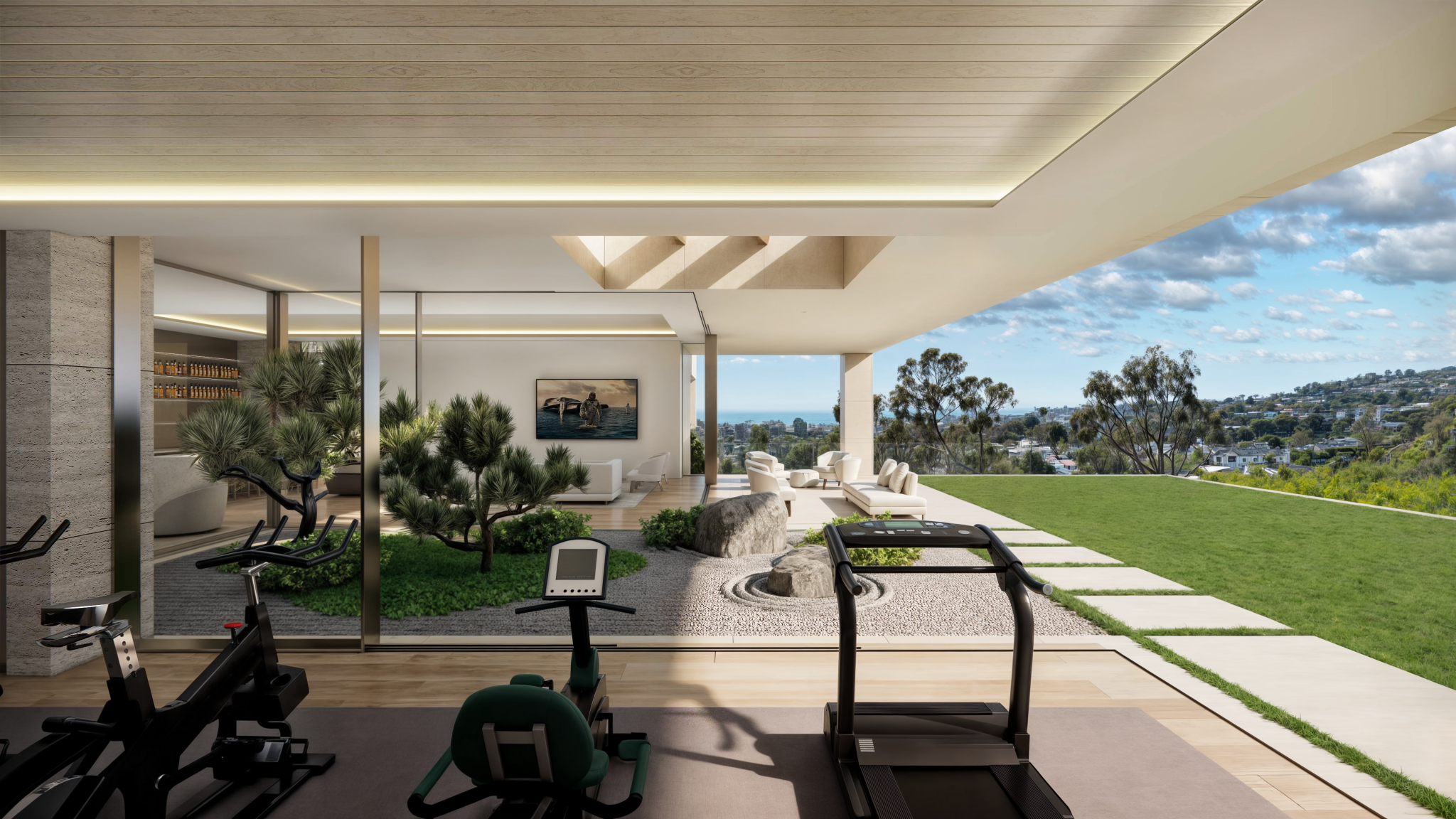 The lower level of the home is accessed by a sculptural staircase that connects to the courtyard below, providing light to the entertainment spaces, gym, and wellness area. Two additional bedrooms share the internal courtyard, while the remainder of the basement is taken up by service spaces and the media room. Both the gym and lower-level entertainment spaces open directly to a lower garden to the west.