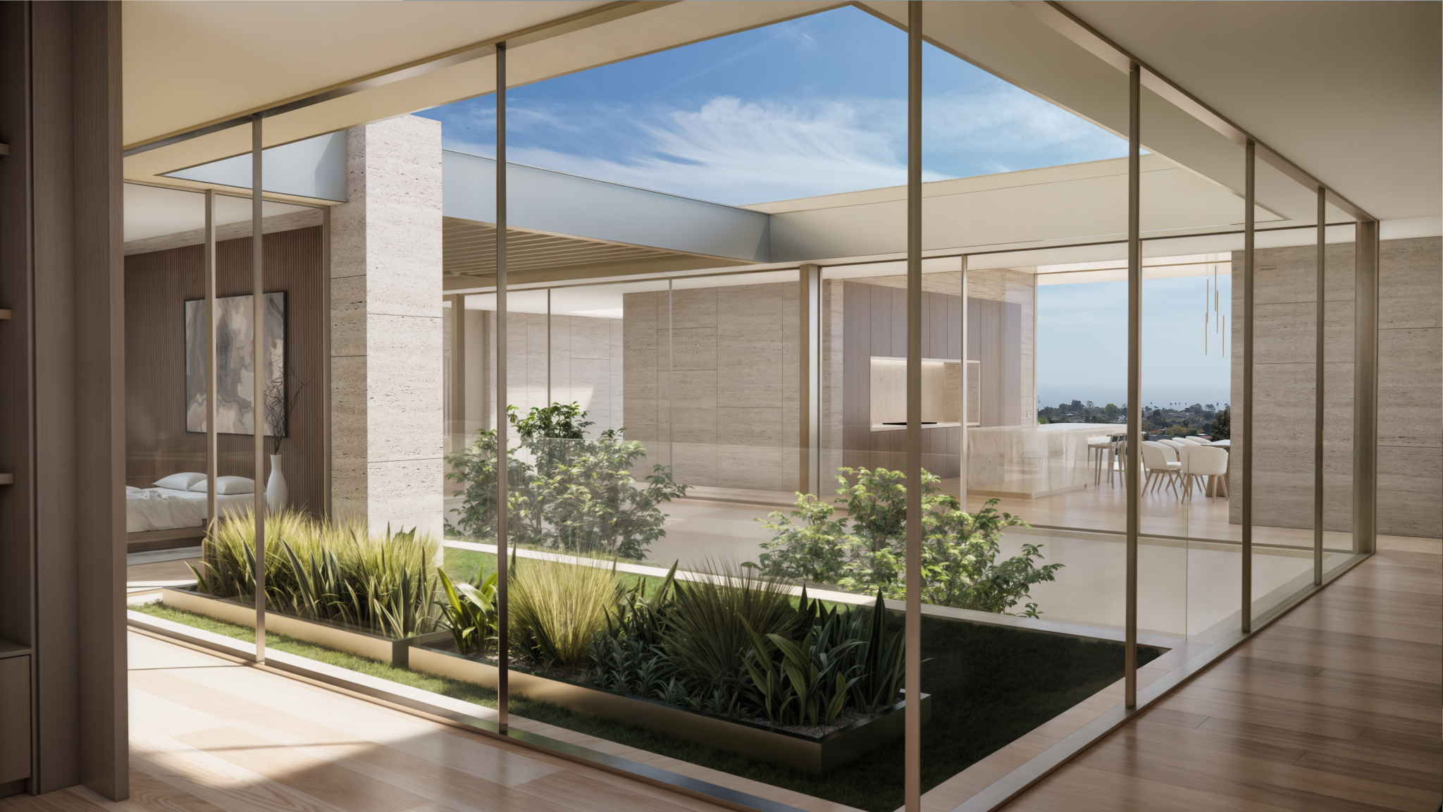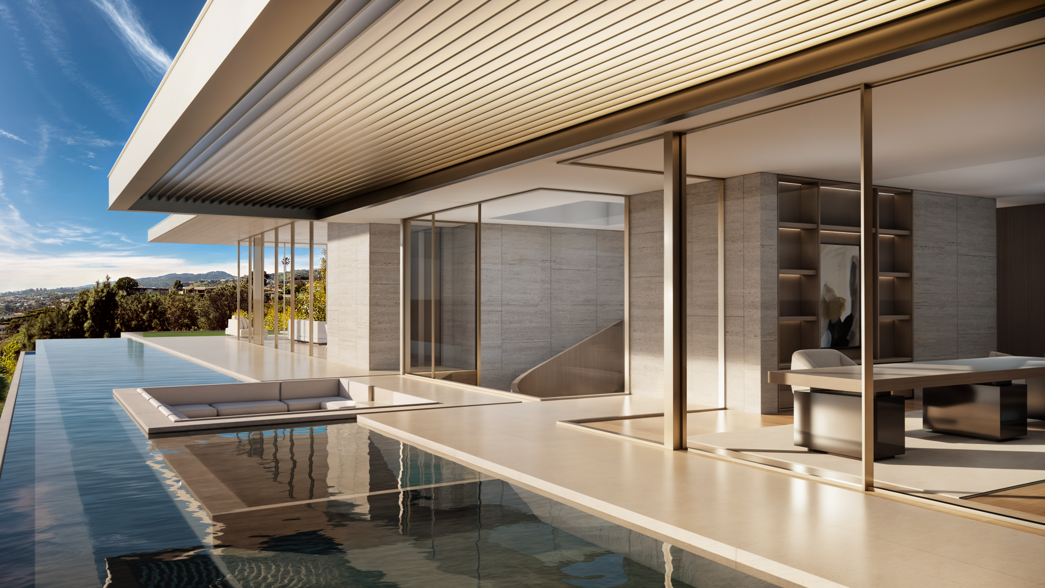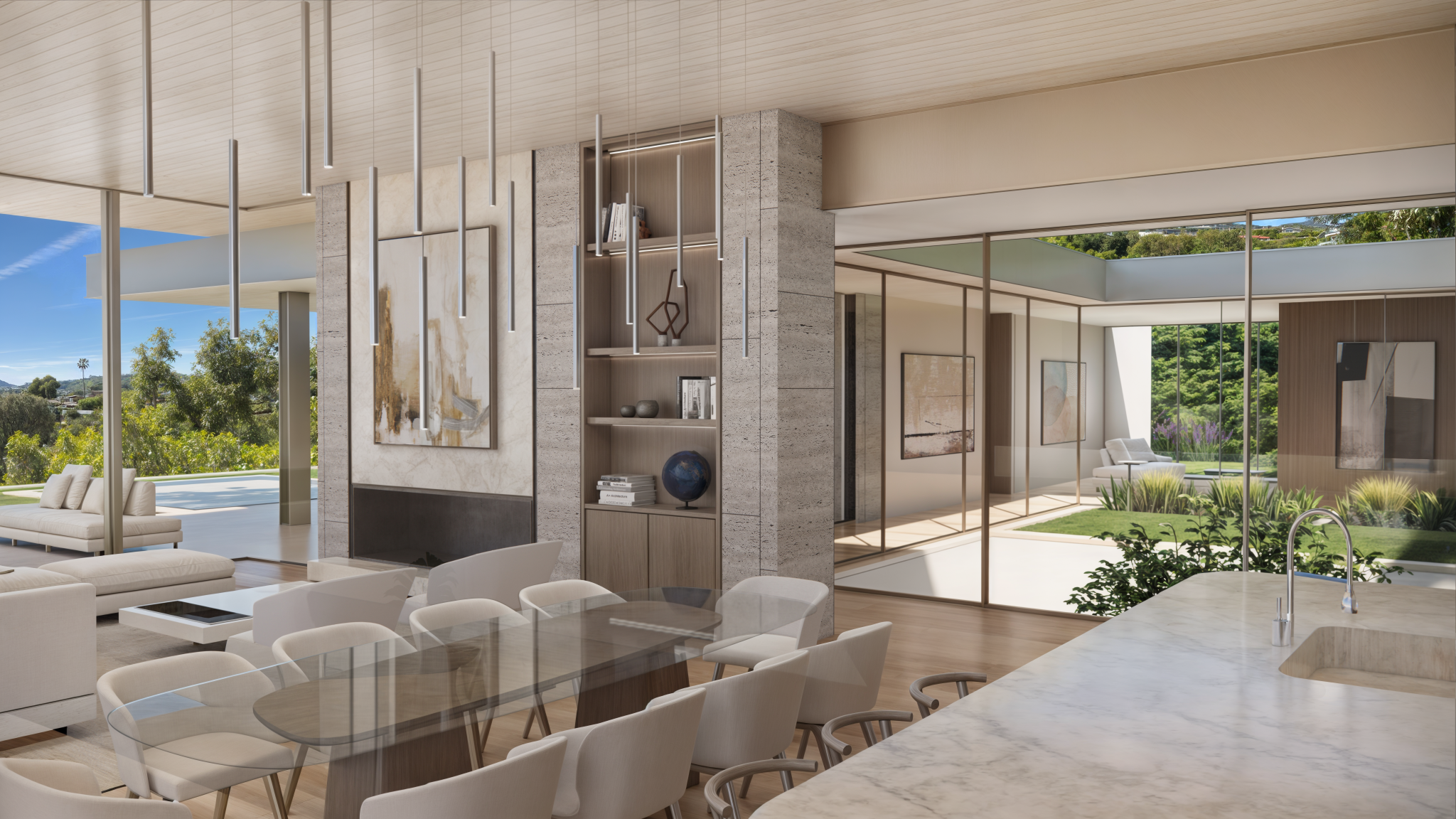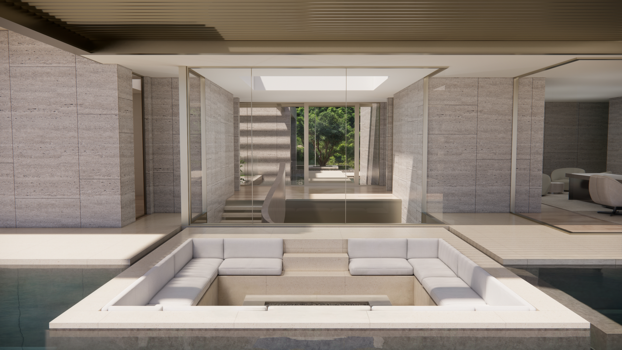 Upon entering the drive court, visitors are guided towards the entrance by a water wall and ornamental tree, where the ocean view is revealed. The southern side of the home is enveloped in water, featuring a sunken fire pit that separates the hot tub area from an Olympic-length lap pool. The house is designed with living spaces and workspaces facing the southern view, separated from the private areas by a courtyard that drops to the lower level and is bridged by a cabana area opening into the rear yard with views of the surrounding landscape.The living room, which includes the kitchen and family areas, offers views to both the south and west and utilizes sliding panels to the courtyard for cross ventilation.