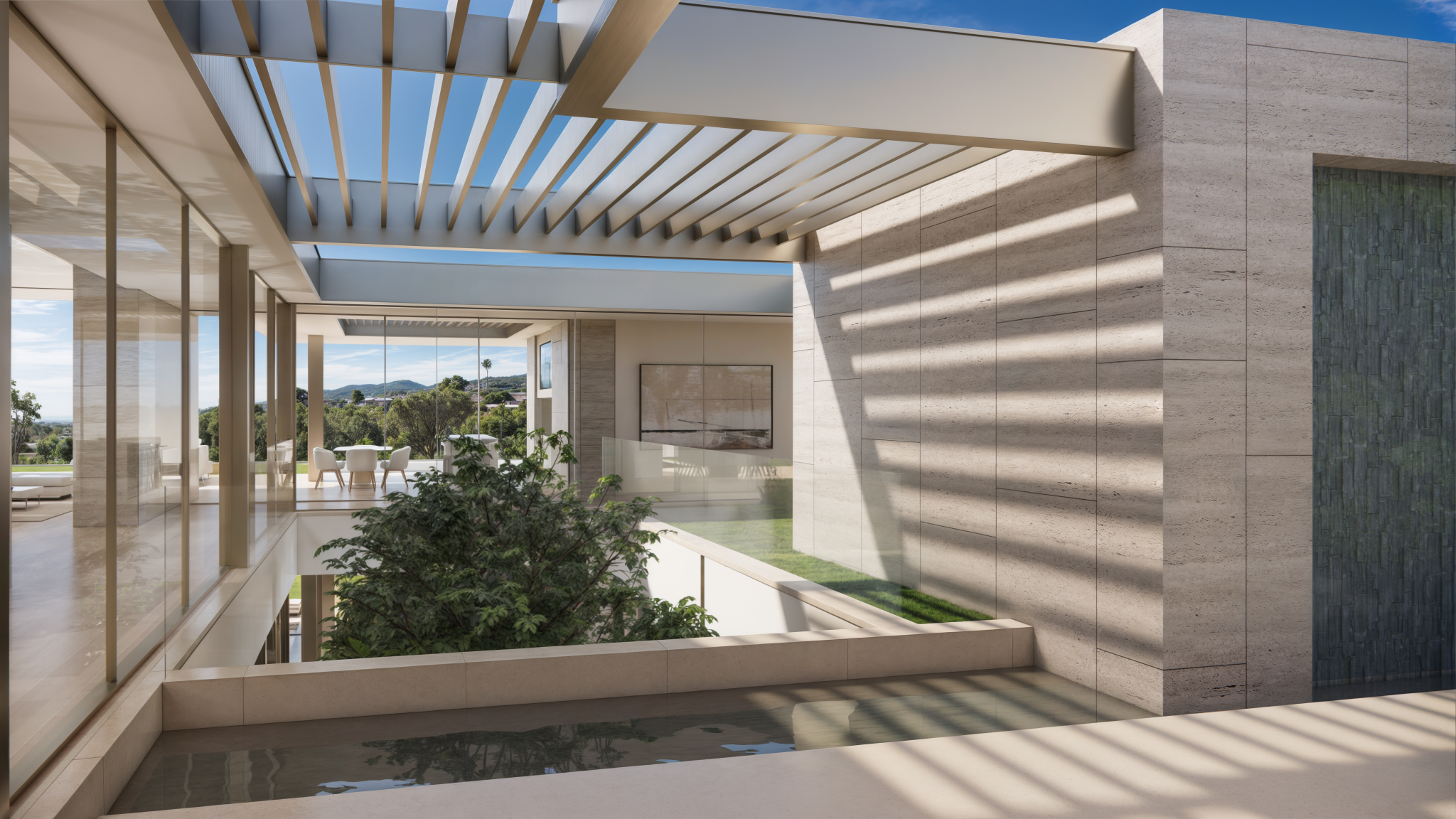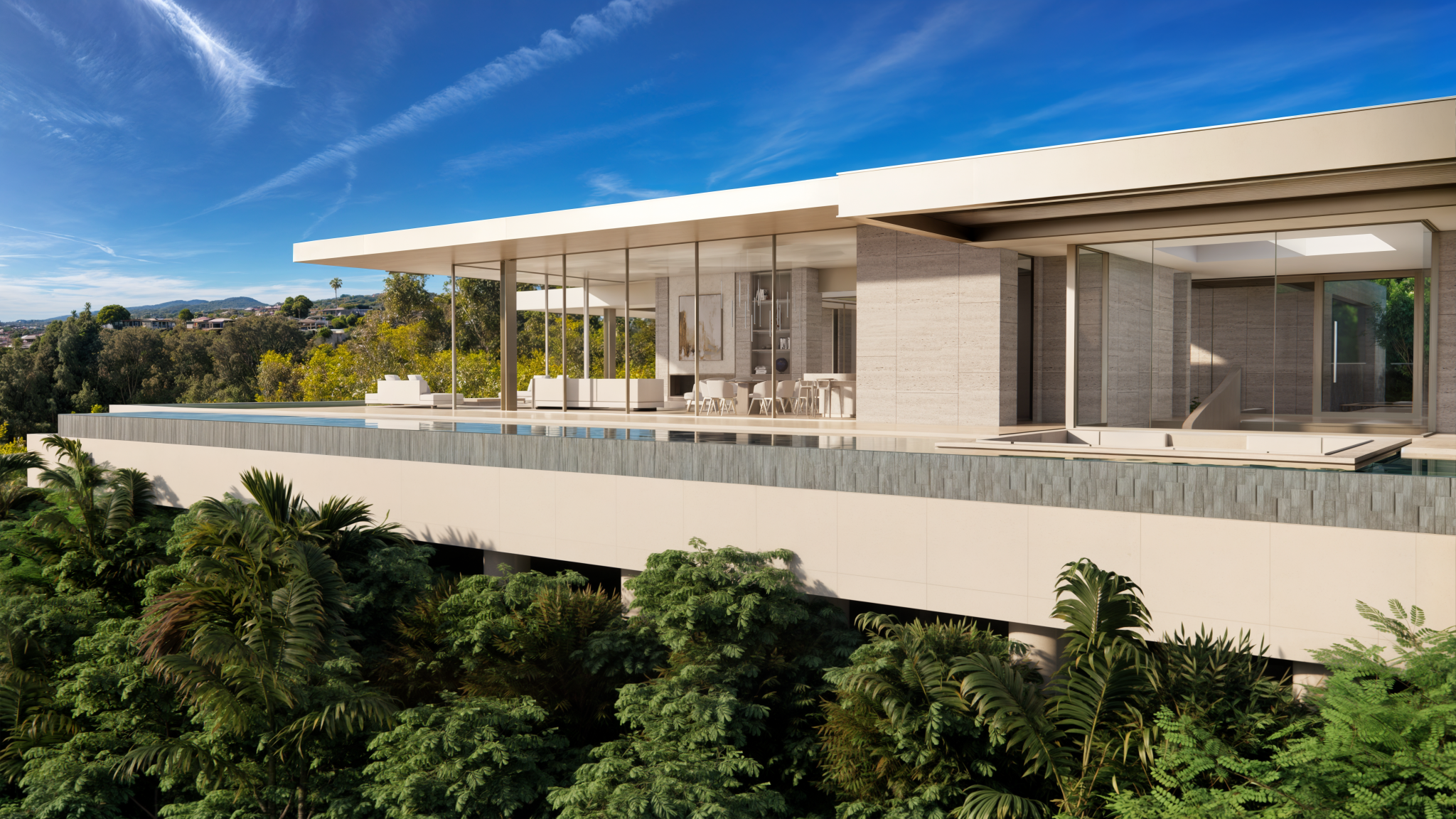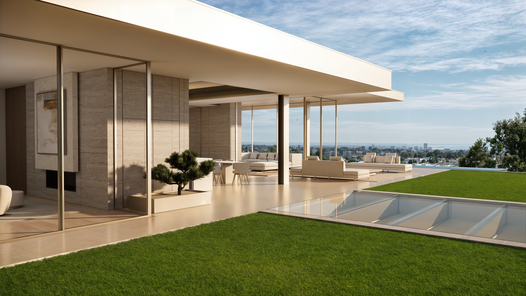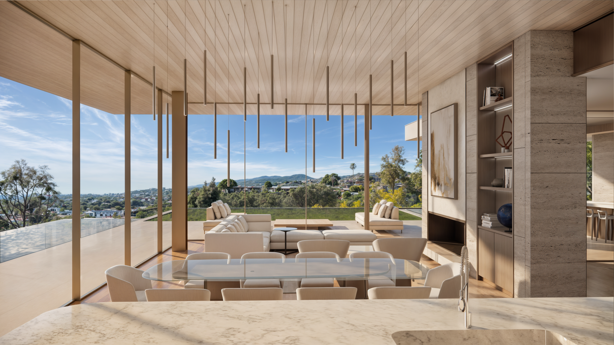 Upon entering the drive court, visitors are guided towards the entrance by a water wall and ornamental tree, where the ocean view is revealed. The southern side of the home is enveloped in water, featuring a sunken fire pit that separates the hot tub area from an Olympic-length lap pool. The house is designed with living spaces and workspaces facing the southern view, separated from the private areas by a courtyard that drops to the lower level and is bridged by a cabana area opening into the rear yard with views of the surrounding landscape.The living room, which includes the kitchen and family areas, offers views to both the south and west and utilizes sliding panels to the courtyard for cross ventilation.