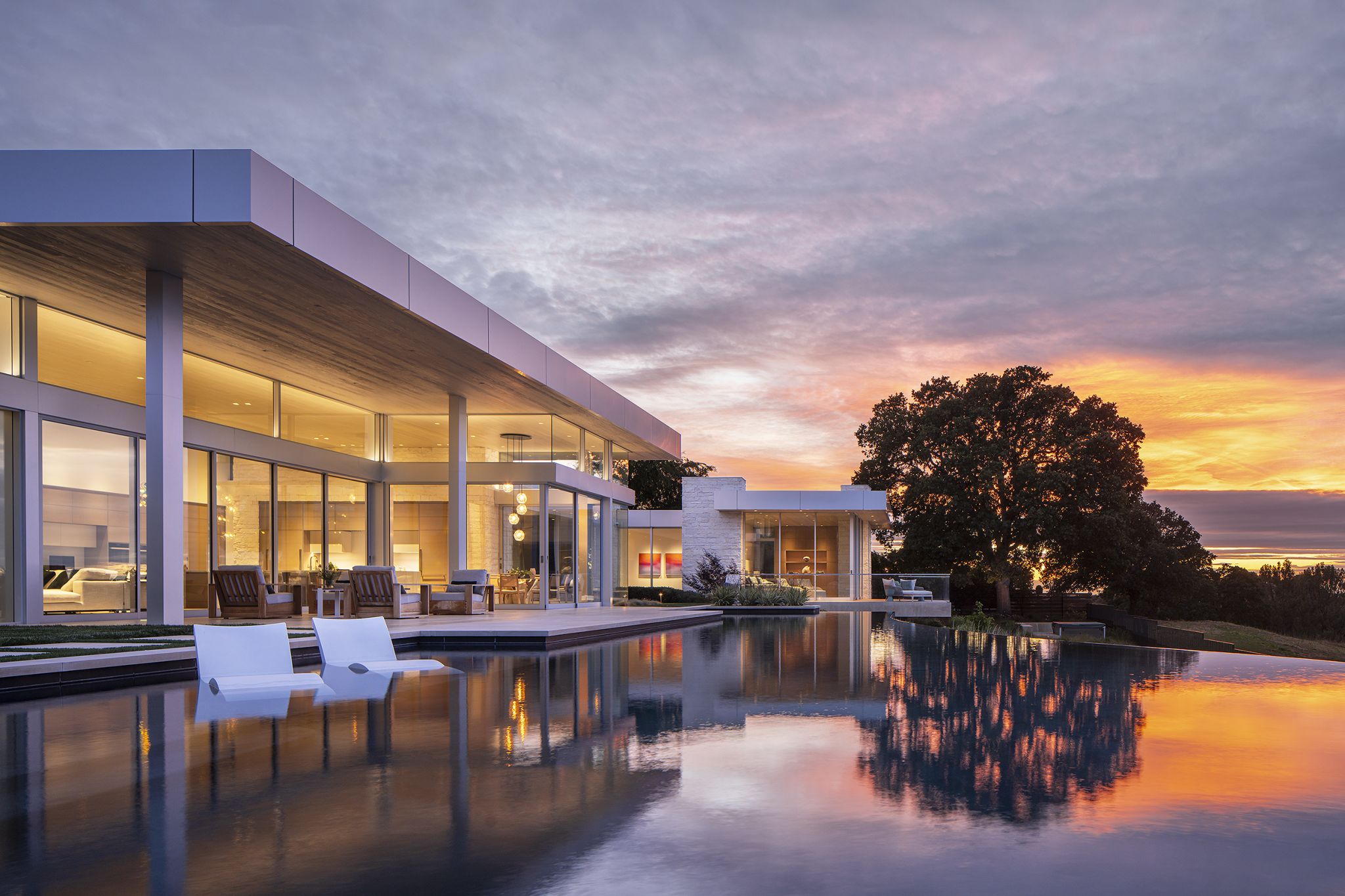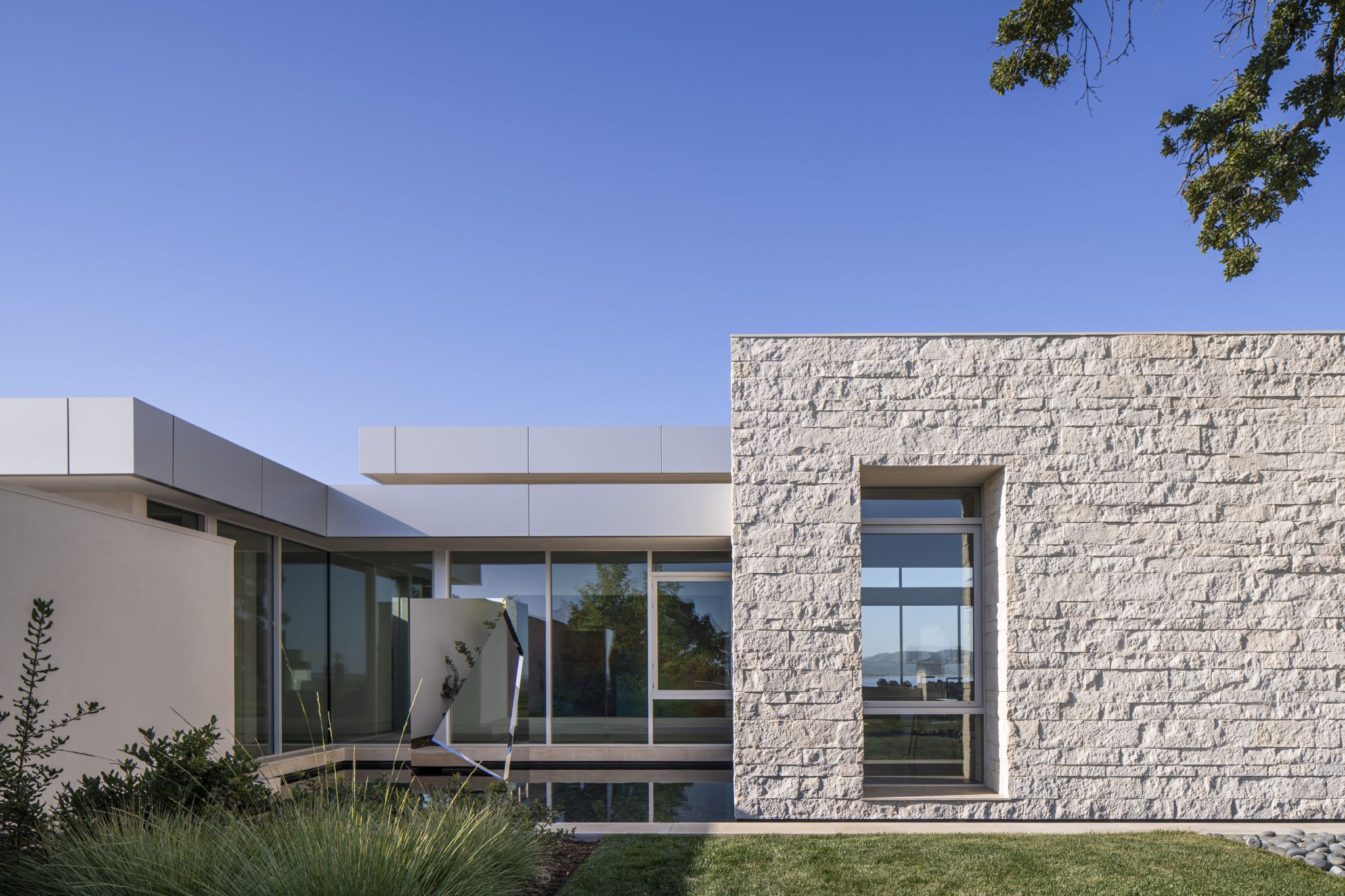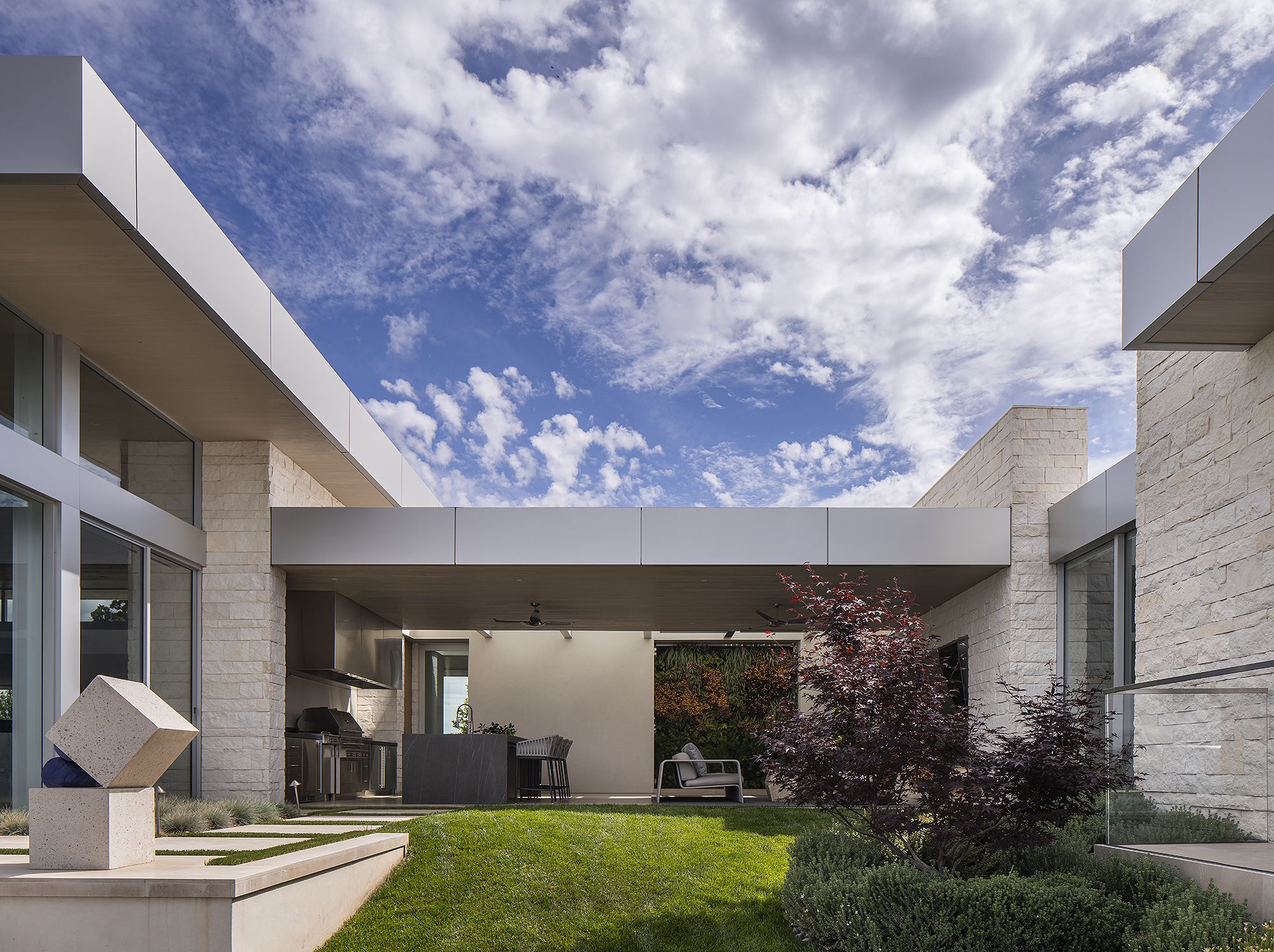 The southern wing houses a guest suite and family room that opens onto another terrace and a roof deck—ideal for enjoying the glittering lights of the valley below at night. Tucked into the northwest corner of the property is a dedicated artist’s studio complete with a kiln, reflecting the clients’ passions—one is an accomplished artist, the other a photographer. The material palette evokes a light, beachside sensibility with soft cream limestone, white and silver metal accents, and a series of cantilevered roofs that appear to float and undulate gently across the landscape.