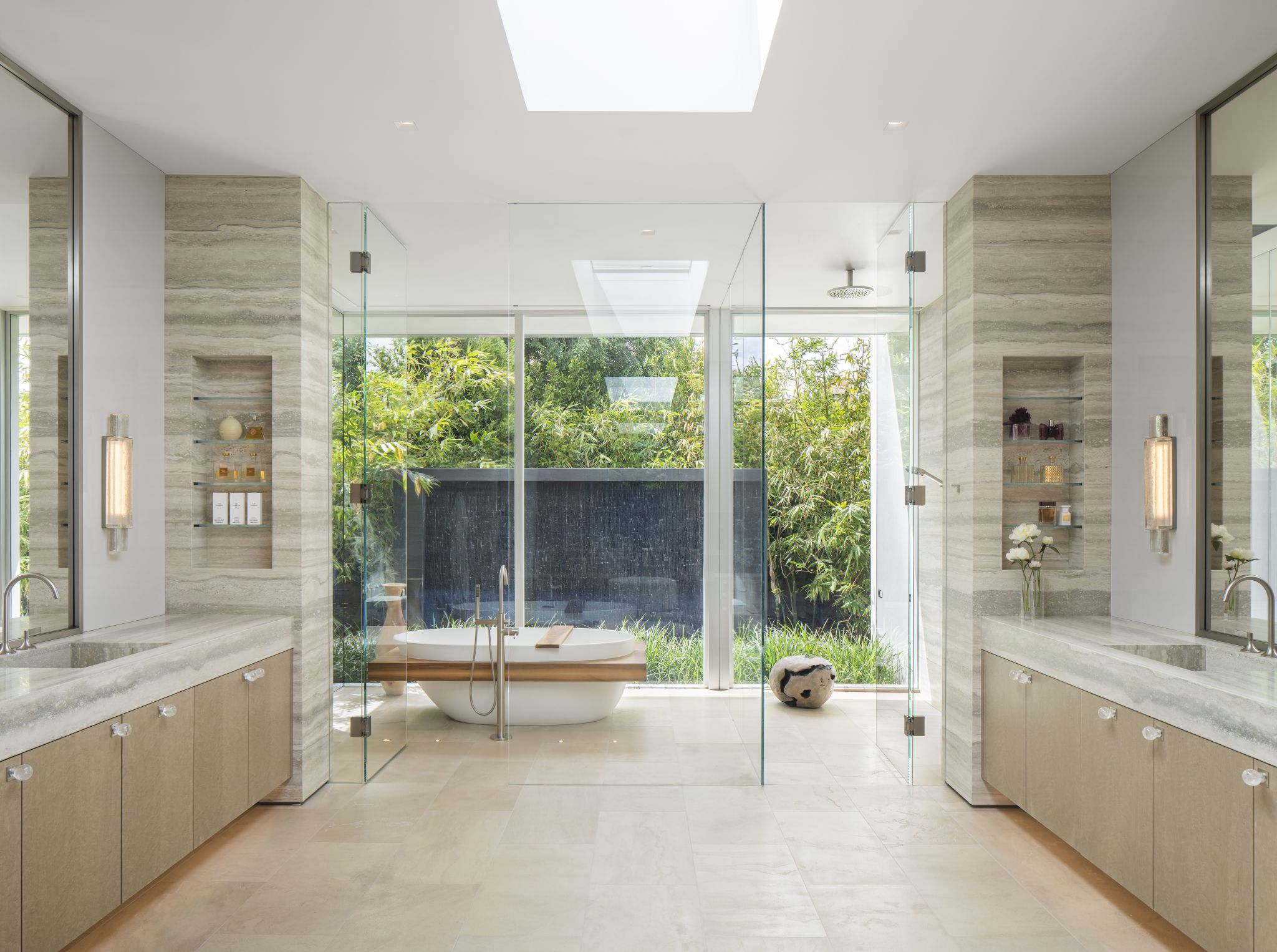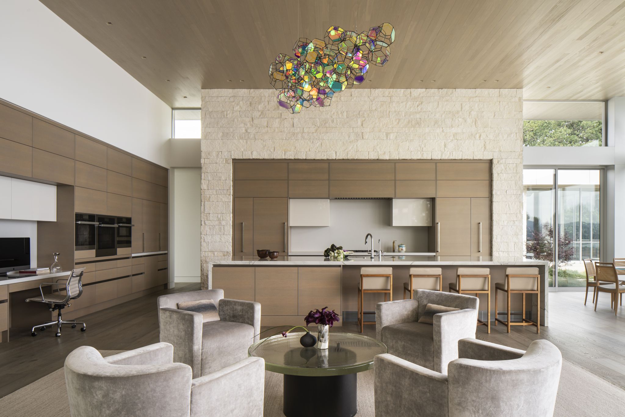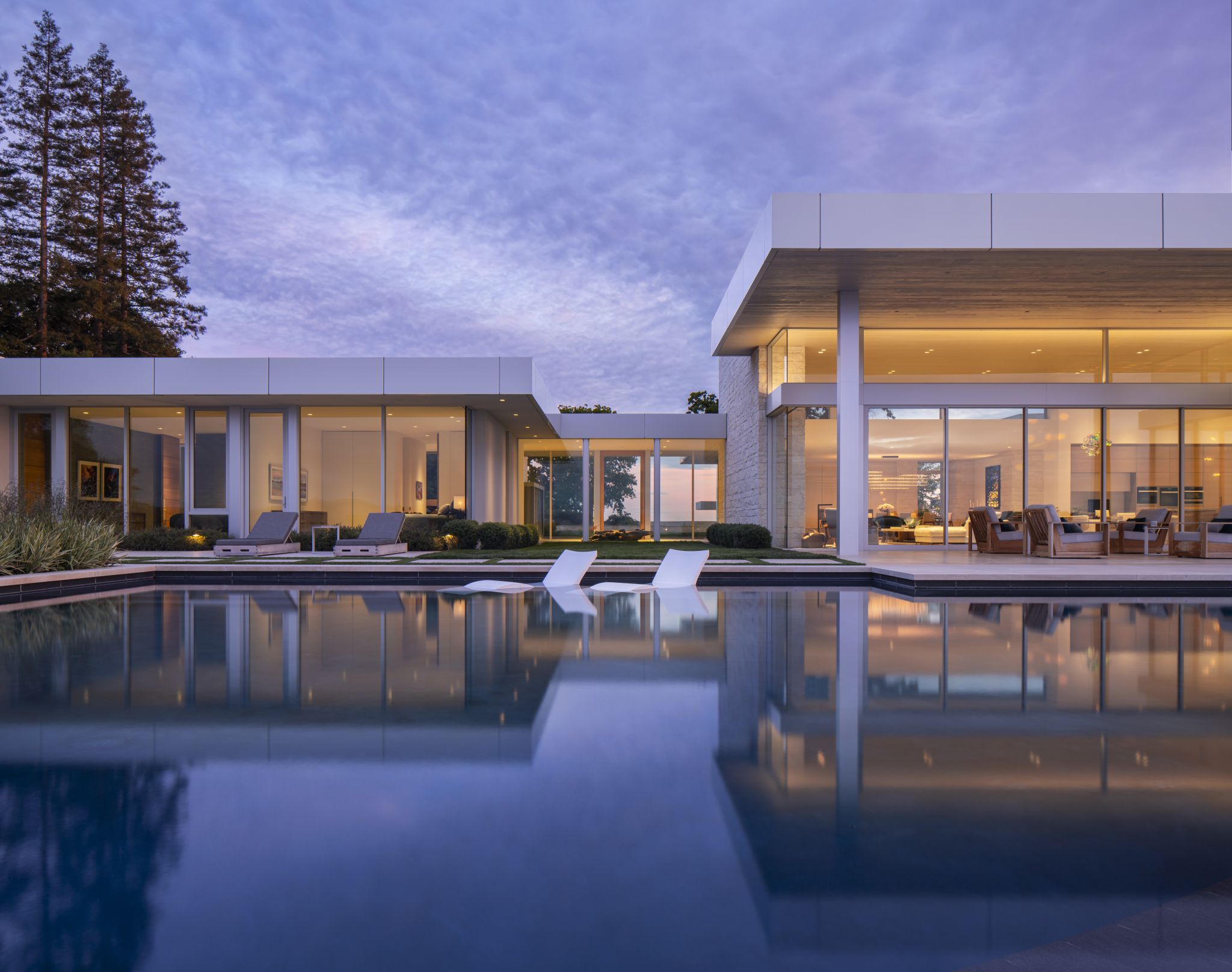 The southern wing houses a guest suite and family room that opens onto another terrace and a roof deck—ideal for enjoying the glittering lights of the valley below at night. Tucked into the northwest corner of the property is a dedicated artist’s studio complete with a kiln, reflecting the clients’ passions—one is an accomplished artist, the other a photographer. The material palette evokes a light, beachside sensibility with soft cream limestone, white and silver metal accents, and a series of cantilevered roofs that appear to float and undulate gently across the landscape.