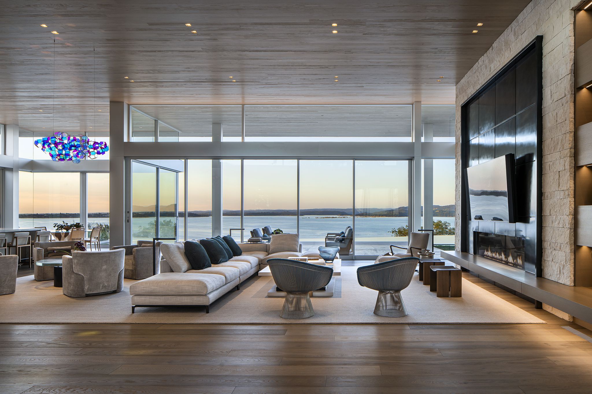 Inside, the entry hall opens directly into the main living area. The piano and dining room are oriented westward, centered on the water feature and filtered sunlight. Meanwhile, the living area, kitchen, and breakfast nook look east over the pool to the lake. Large sliding glass walls connect the indoors with a shaded terrace, extending the living space into the landscape. The pool follows a sinuous form that enhances the sense of continuity between the home and the lake, reinforcing a seamless water-to-water connection.