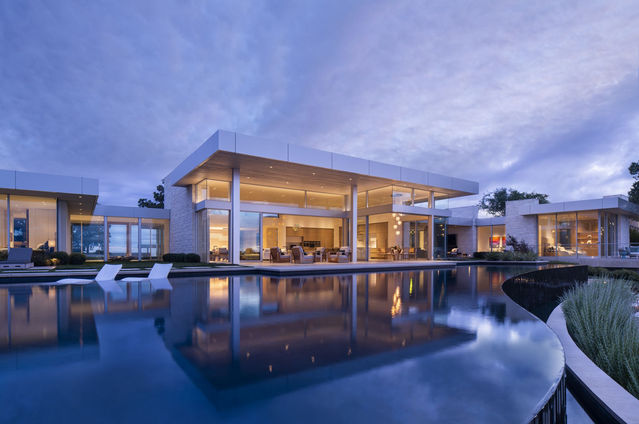 The home is organized into three distinct sections. To the north, we placed the main bedroom and private spaces. The central zone contains the public living and dining areas, while a guest wing and family room stretch to the south. Entry is designed as a journey: visitors pass through a canopied gate, ascend a short flight of steps, and follow a winding path that navigates between two preserved oak trees. This leads to a dramatic moment—crossing a water feature before reaching the front door, framed by a fully glazed entry hall that offers a first glimpse of the lake beyond.