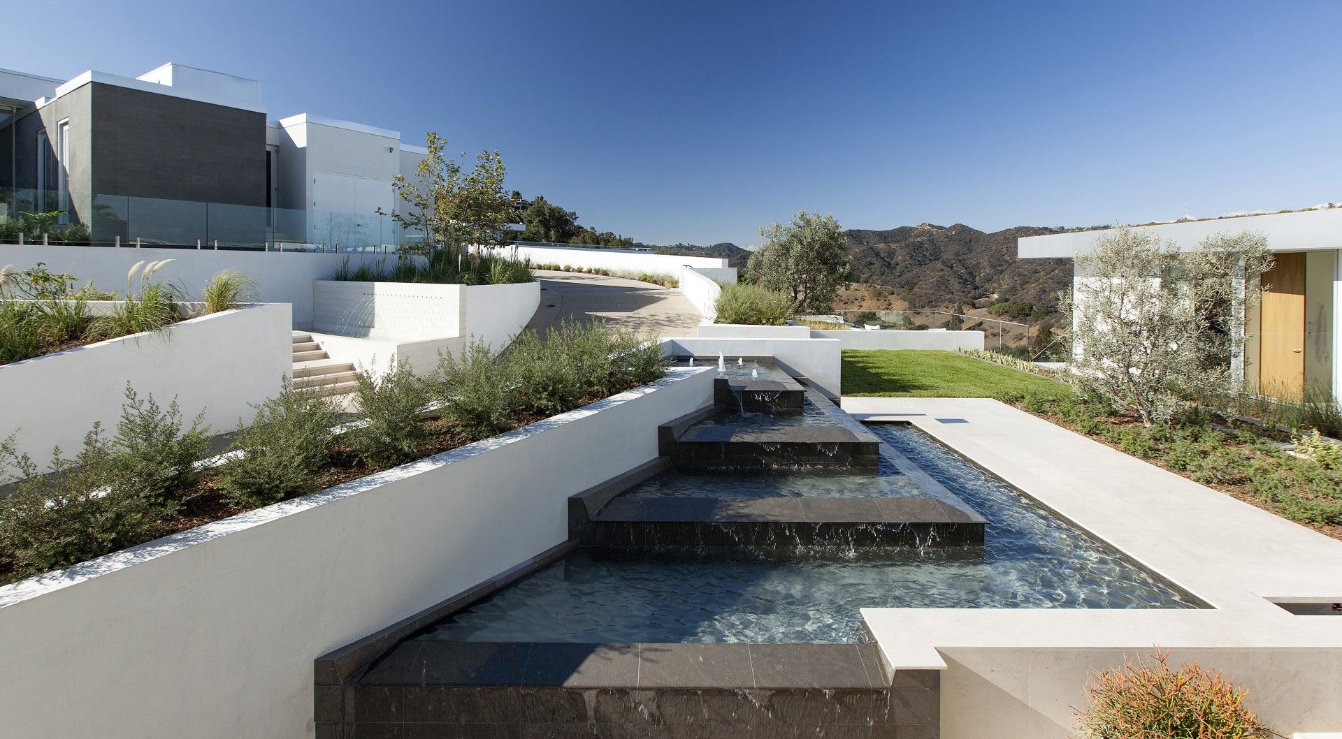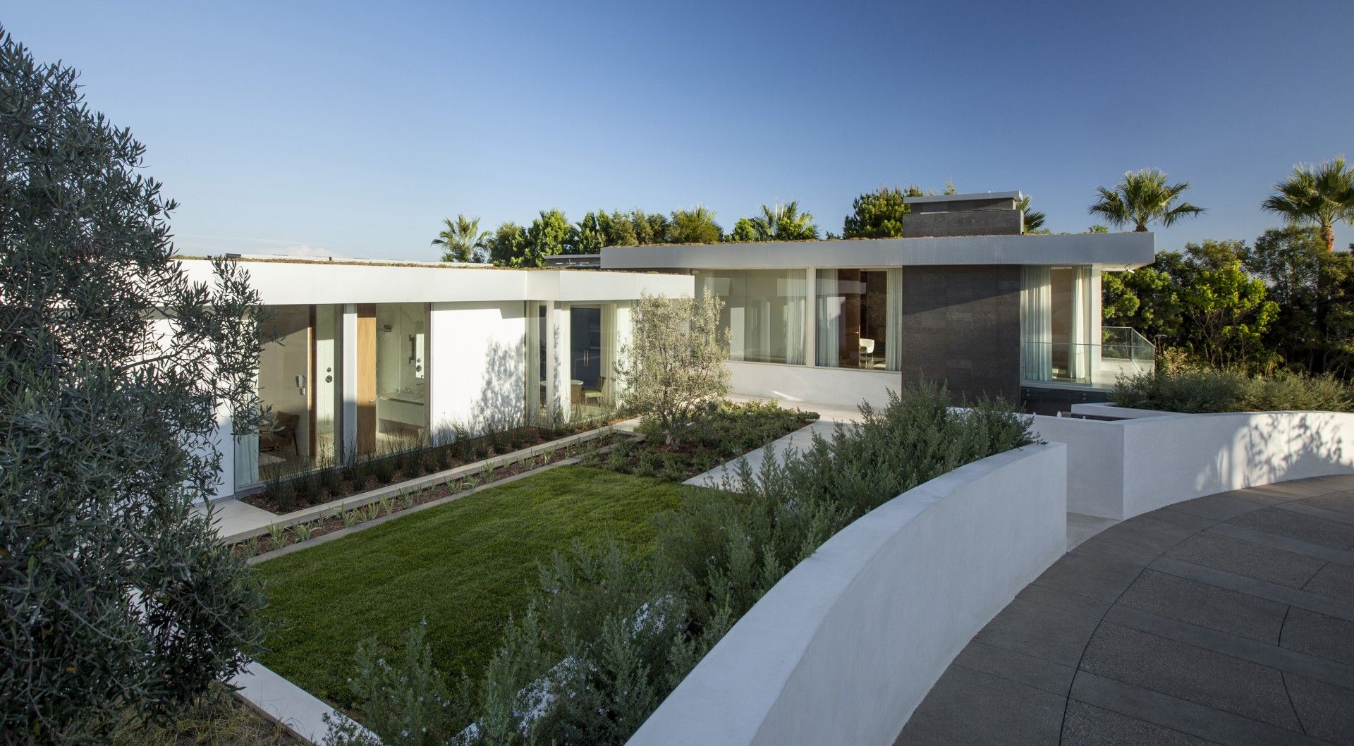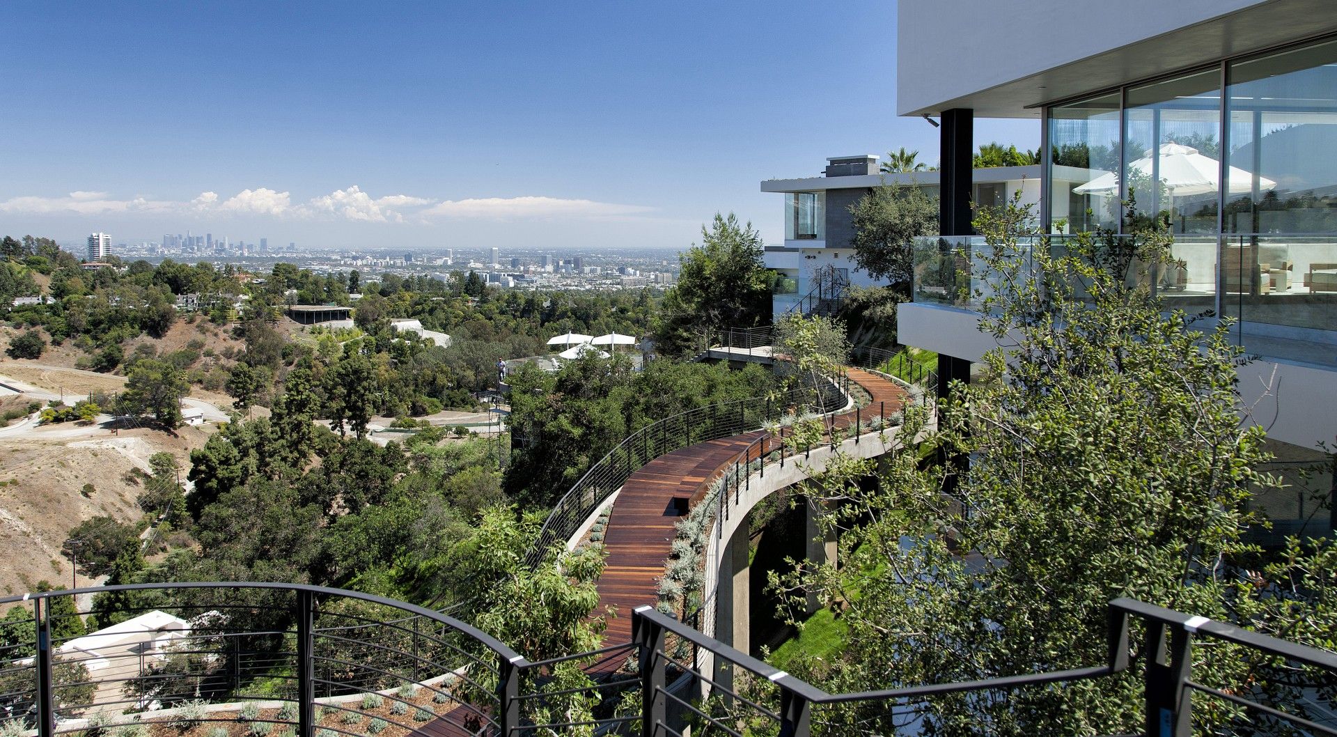 This is a reworking of a house we finished in 2010. The new owner wanted to expand the scope, add more parking, as well as a guest house and a wellness spa. We achieved most of the additional program by removing the driveway and placing the garage and wellness spa below. Our client requested a place to go walk and admire the view. Because the site is very steep, our solution involved an aerial walkway through the trees complete with boardwalk, gardens, and viewing platforms. The three buildings enjoy a similar palette creating a unique estate above the Los Angeles skyline.