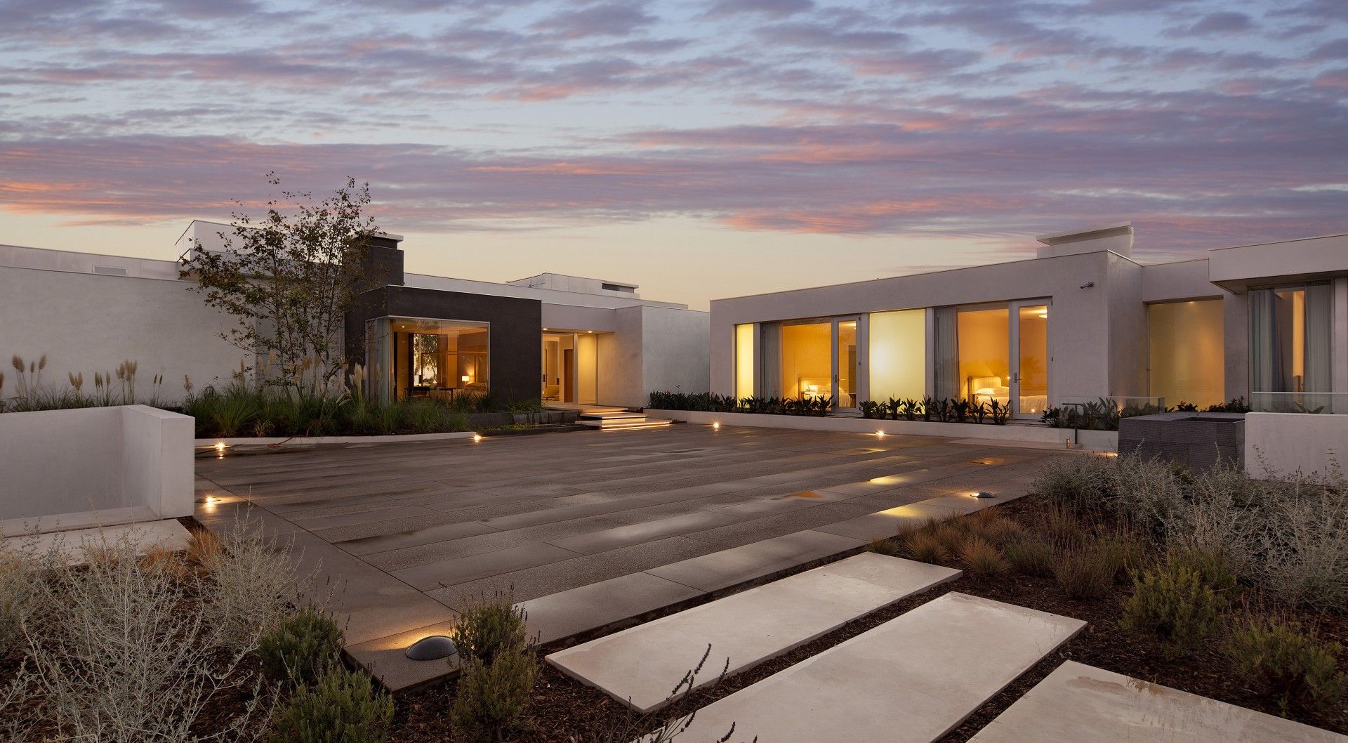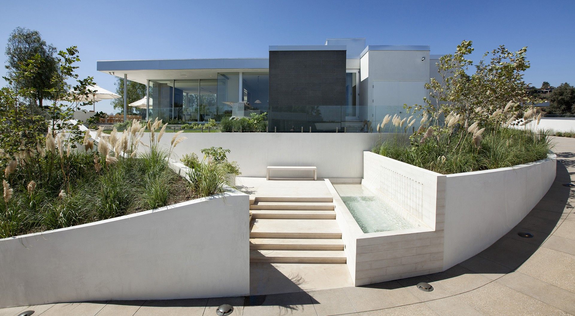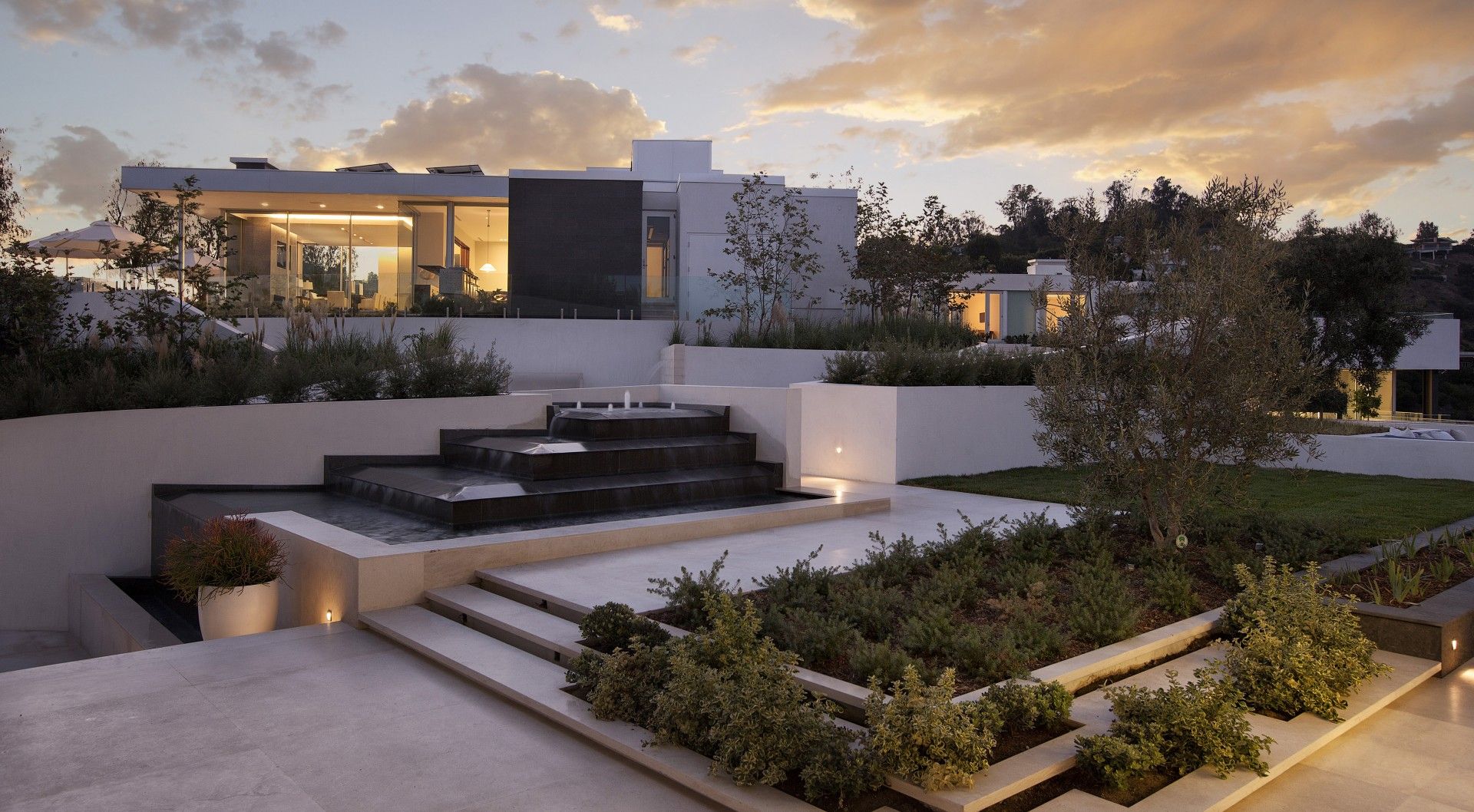 This is a reworking of a house we finished in 2010. The new owner wanted to expand the scope, add more parking, as well as a guest house and a wellness spa. We achieved most of the additional program by removing the driveway and placing the garage and wellness spa below. Our client requested a place to go walk and admire the view. Because the site is very steep, our solution involved an aerial walkway through the trees complete with boardwalk, gardens, and viewing platforms. The three buildings enjoy a similar palette creating a unique estate above the Los Angeles skyline.