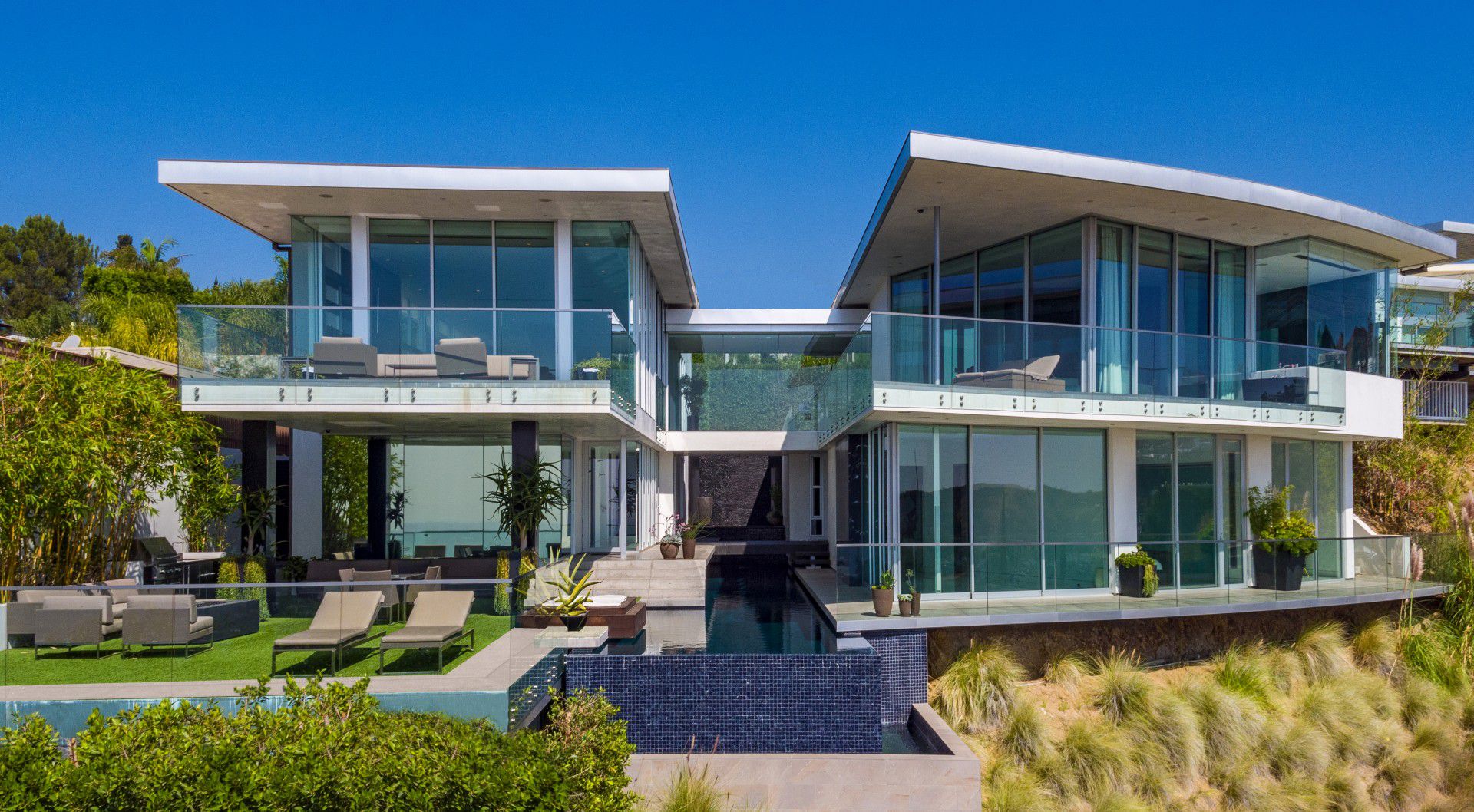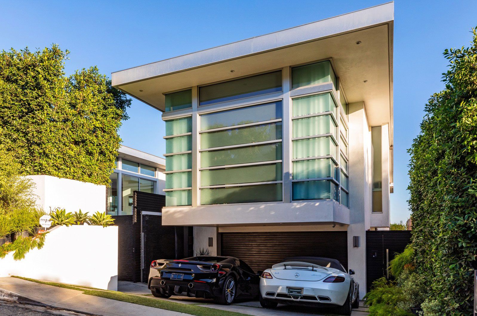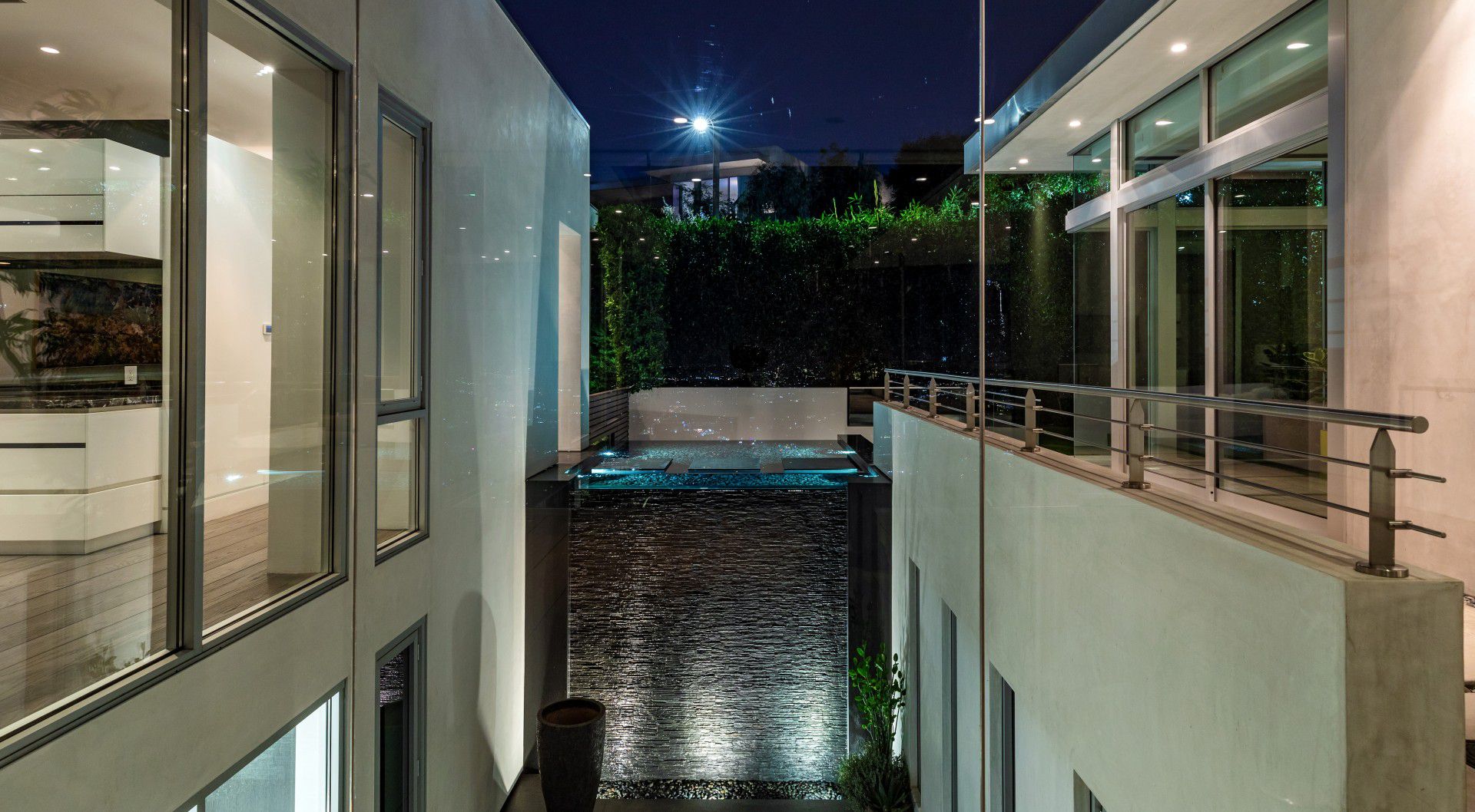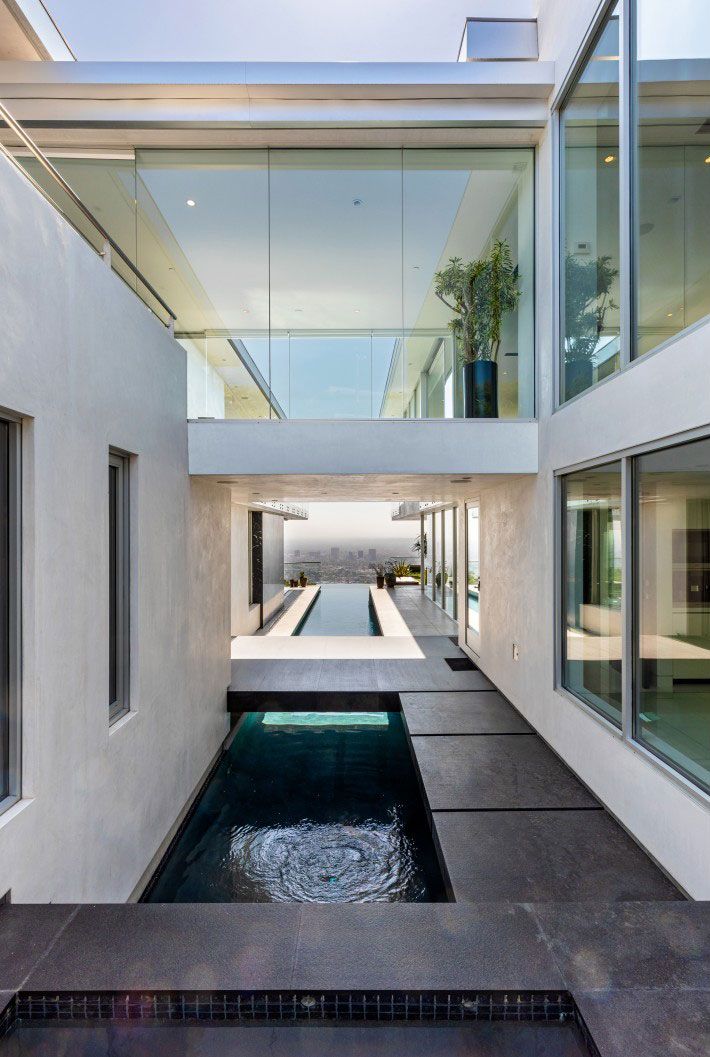 This was the first substantial project undertaken by McClean Design in Los Angeles. Set on a 13,357-square-foot lot in the Bird Streets area of the city, a neighborhood often associated with musicians and movie stars. Unusually, this house is bisected by a pool and water feature in response to the client’s request for a seventy-five-foot-long pool, a constraint that the architect says he used to imagine the residence as a “canyon, deep and narrow with river running through it.” The pool begins with a water wall near the entry and ends with an “infinity drop-off to the city lights beyond” at the opposite side of the site above Sunset Strip. Full height glazing allows residents to take in the view and emphasizes the indoor-outdoor design which takes full advantage of the local climate. The pool also bisects the functions of the house, with the private spaces, including the master bedroom and a study, on one side and the public ones on the other. The entry bridge spans the pool and connects the two wings. A clerestory window marks the main stair, which descends to a secondary bridge over the pool that connects the lower level garage to the guest rooms and media area. There are three guest rooms on the lower level. These bedrooms have openings to the rear garden and the pool. The lower level also has an outdoor terrace and lounging area. The plan for the 7,000-square-foot residence was the result of close collaboration with the original client. The house was sold and extensively remodeled by McClean Design in 2016 at the request of the new owner, Tim Bergling, known under the stage name Avicii. The remodeling included the addition of a recording studio and accessory spaces on the lower level, created by reclaiming part of the existing four-car garage. The reworking of the house also included extensive changes to the finishes. The overall design can be described as crisp and comfortable, with clearly defined edges and surfaces. The material palette includes Negro Marquina marble and Alcazar Portico slate on exterior walls; the same marble was used on interior walls. Floors are in oak plank and Super Thassos (white glass). The house is shielded from the street by dense vegetation, assuring the privacy of the owner.