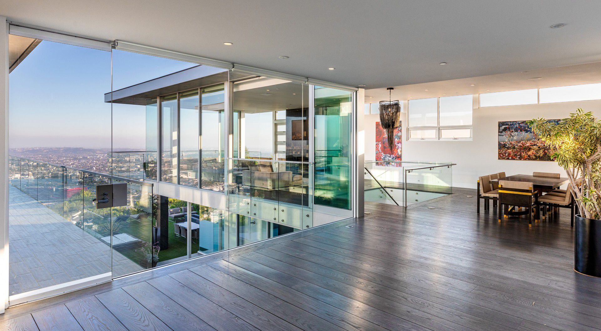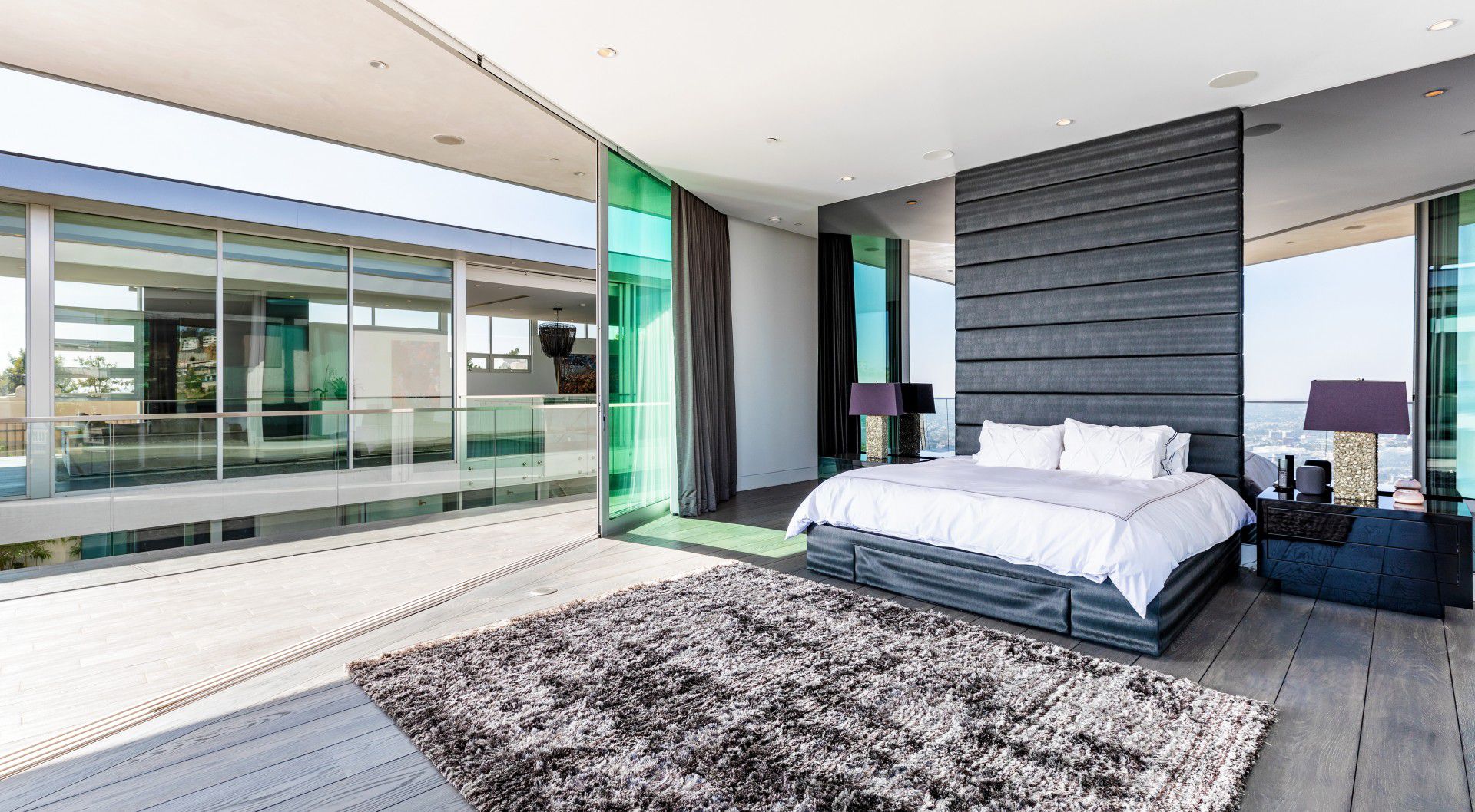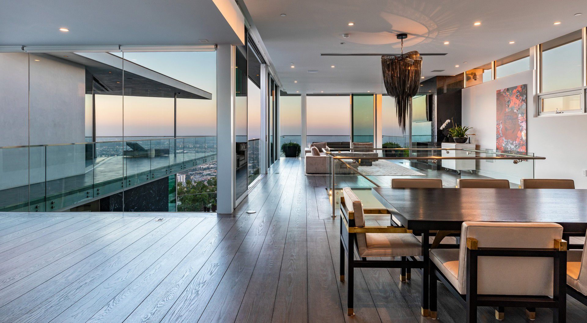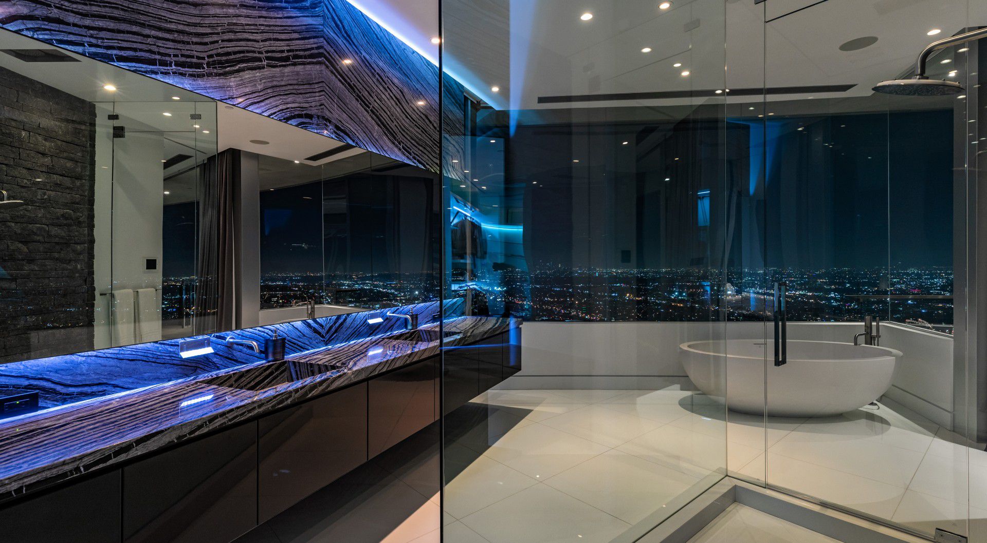 This was the first substantial project undertaken by McClean Design in Los Angeles. Set on a 13,357-square-foot lot in the Bird Streets area of the city, a neighborhood often associated with musicians and movie stars. Unusually, this house is bisected by a pool and water feature in response to the client’s request for a seventy-five-foot-long pool, a constraint that the architect says he used to imagine the residence as a “canyon, deep and narrow with river running through it.” The pool begins with a water wall near the entry and ends with an “infinity drop-off to the city lights beyond” at the opposite side of the site above Sunset Strip. Full height glazing allows residents to take in the view and emphasizes the indoor-outdoor design which takes full advantage of the local climate. The pool also bisects the functions of the house, with the private spaces, including the master bedroom and a study, on one side and the public ones on the other. The entry bridge spans the pool and connects the two wings. A clerestory window marks the main stair, which descends to a secondary bridge over the pool that connects the lower level garage to the guest rooms and media area. There are three guest rooms on the lower level. These bedrooms have openings to the rear garden and the pool. The lower level also has an outdoor terrace and lounging area. The plan for the 7,000-square-foot residence was the result of close collaboration with the original client. The house was sold and extensively remodeled by McClean Design in 2016 at the request of the new owner, Tim Bergling, known under the stage name Avicii. The remodeling included the addition of a recording studio and accessory spaces on the lower level, created by reclaiming part of the existing four-car garage. The reworking of the house also included extensive changes to the finishes. The overall design can be described as crisp and comfortable, with clearly defined edges and surfaces. The material palette includes Negro Marquina marble and Alcazar Portico slate on exterior walls; the same marble was used on interior walls. Floors are in oak plank and Super Thassos (white glass). The house is shielded from the street by dense vegetation, assuring the privacy of the owner.