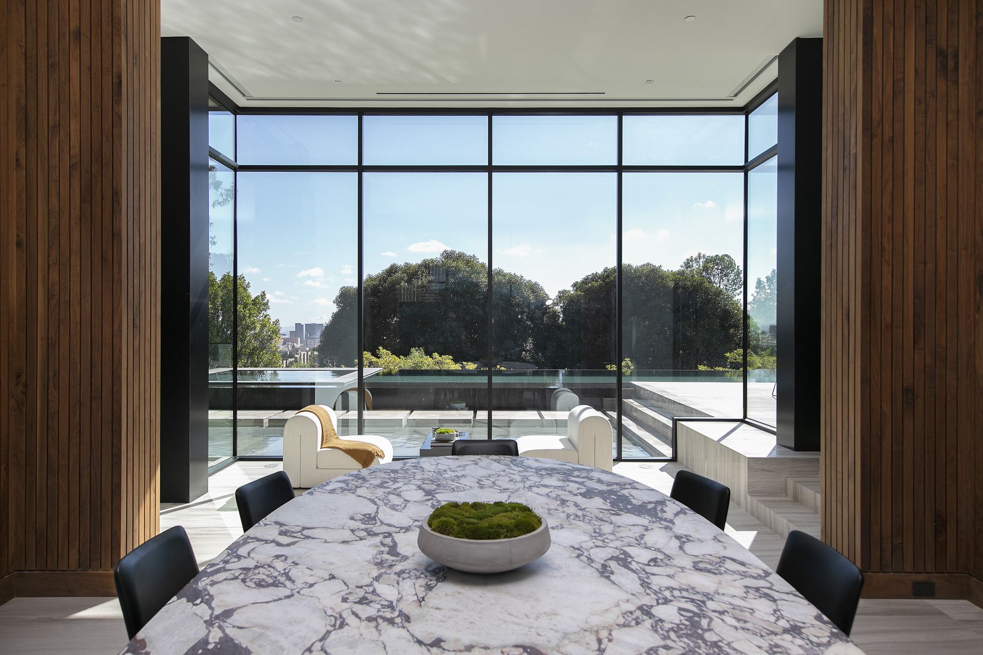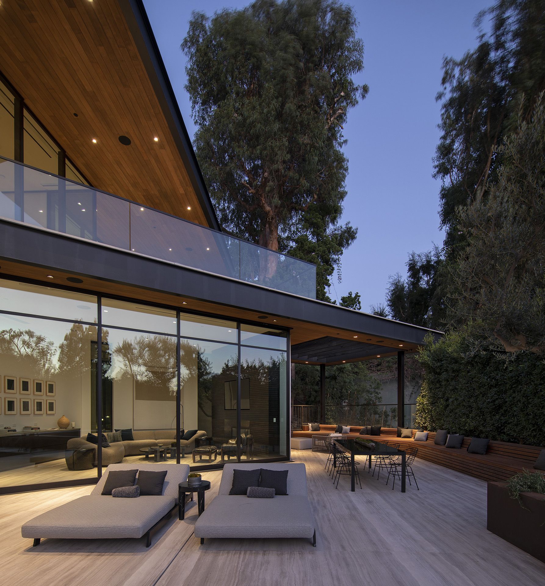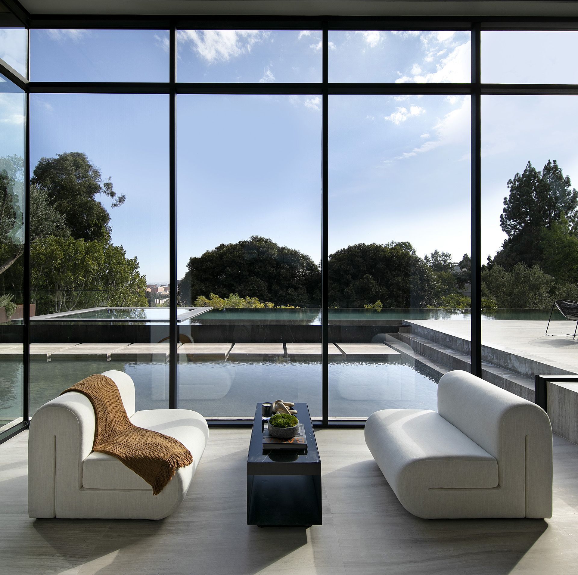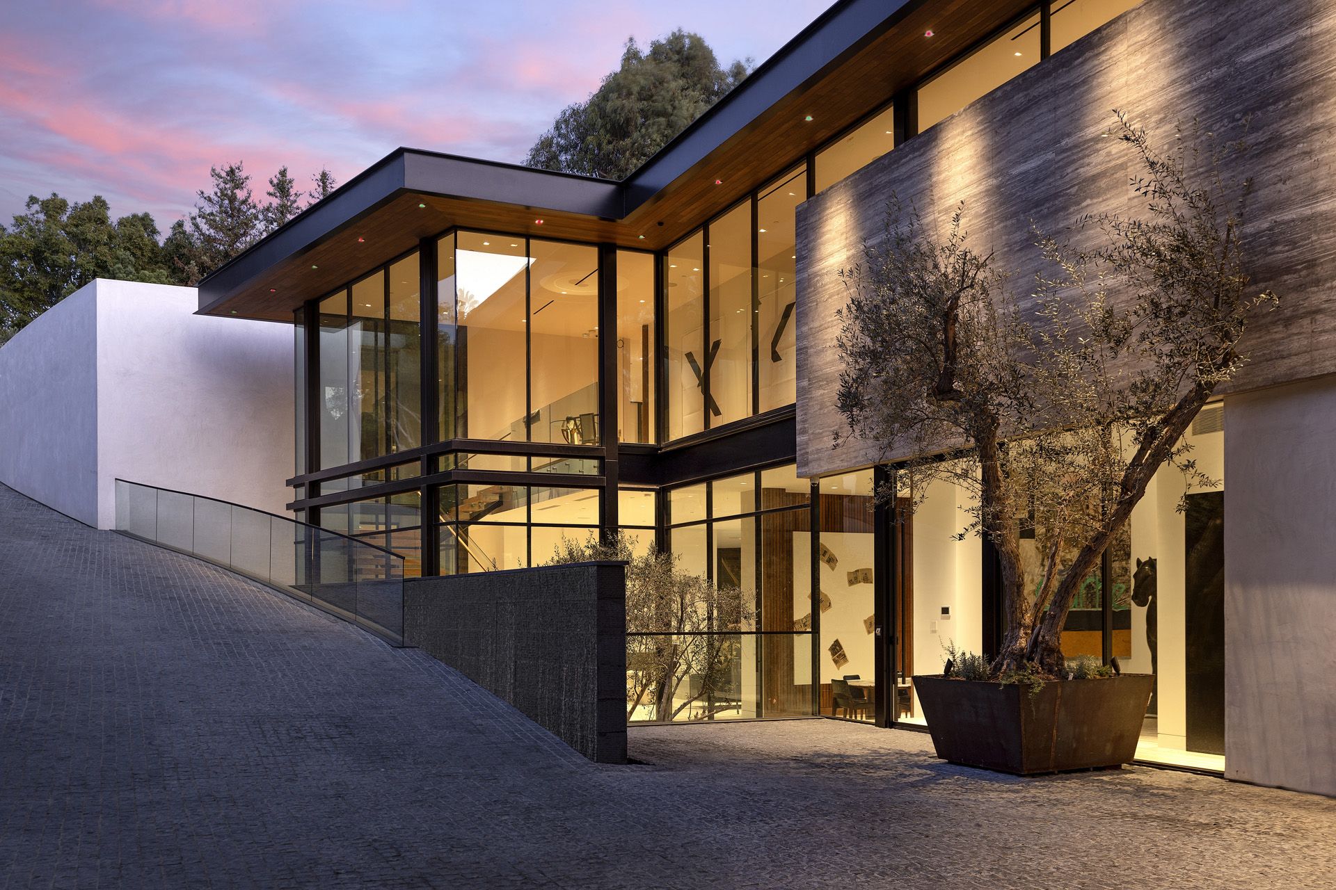 McClean Design always try to capture the spirit of place and they’ve achieved this in a house that they designed in the Bel Air neighborhood to the north of Sunset Boulevard in west Los Angeles. Impressive gates mark the boundaries of this coveted residential estate laid out a century ago by Alphonzo Bell, a farmer who struck oil, bought a ranch in the foothills of the Santa Monica Mountains and developed it with a respect for the topography that is rare today. The lots are large, many of the houses are hidden by lush landscaping from the steep, winding streets, and the site of Perugia is surrounded by trees. The challenge for the architects was to preserve this bosky setting while giving the living areas and the upper-level bedrooms sweeping views over the distant lights of the city. To achieve a balance of openness and enclosure, the garage and motor court are pushed to the rear, and the gym, entertainment and wellness areas occupy a naturally lit basement that opens onto a shady deck. The two upper-level wings are cranked to exploit the views, much as a flower inclines its head towards the sun. That imparts a dynamic quality to the geometry of the floor and roof planes, and to the flow of space within. The angularity is softened by the water wall that flanks the gently curved drive and the shallow pools that refract light into a three-story glass staircase to the north and the living areas to the south. The double-height entry leads into the kitchen-breakfast room and a formal dining room to the other side. A library, family room and guest bedroom extend east from the spacious living area, and most of these areas open through pocketing sliders to a broad pool terrace. The staircase leads up to a primary suite that is as expansive and well-appointed as an apartment. A hallway links four guest bedrooms that share an outdoor terrace, and together they form a sharply angled wing extending over the garage. Travertine cladding, marble floors and rich tones of wood enrich the character of this airy, generously proportioned house and its understated furnishings. Everywhere, the sharp edges of the steel beams that support long spans and shady canopies play off the soft fronds of foliage in a harmonious juxtaposition of construction and nature.