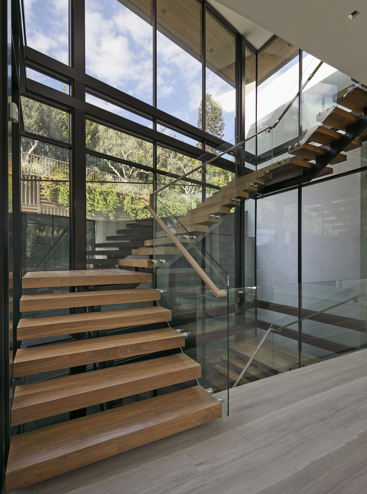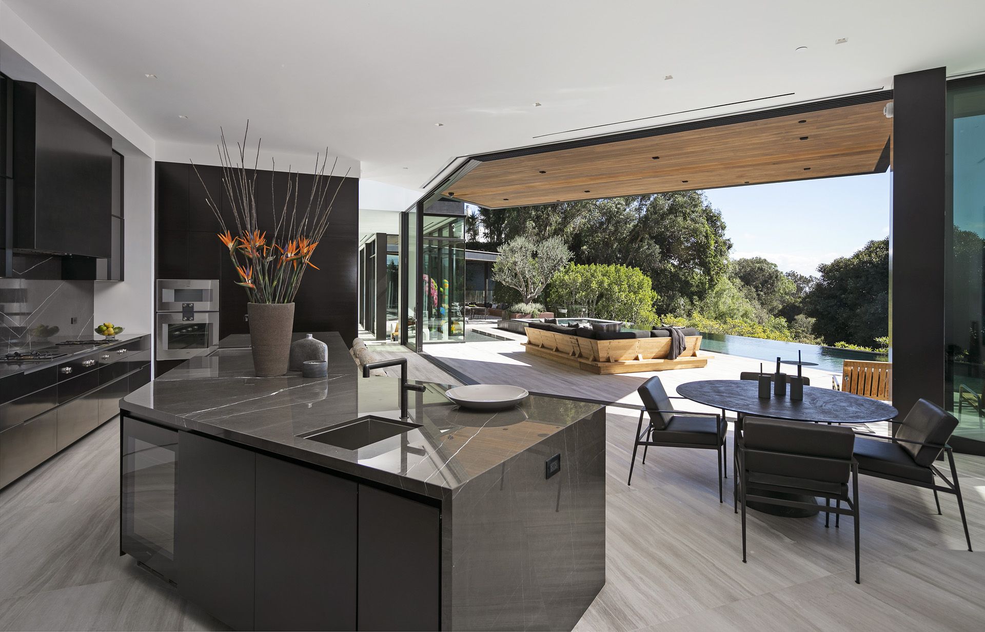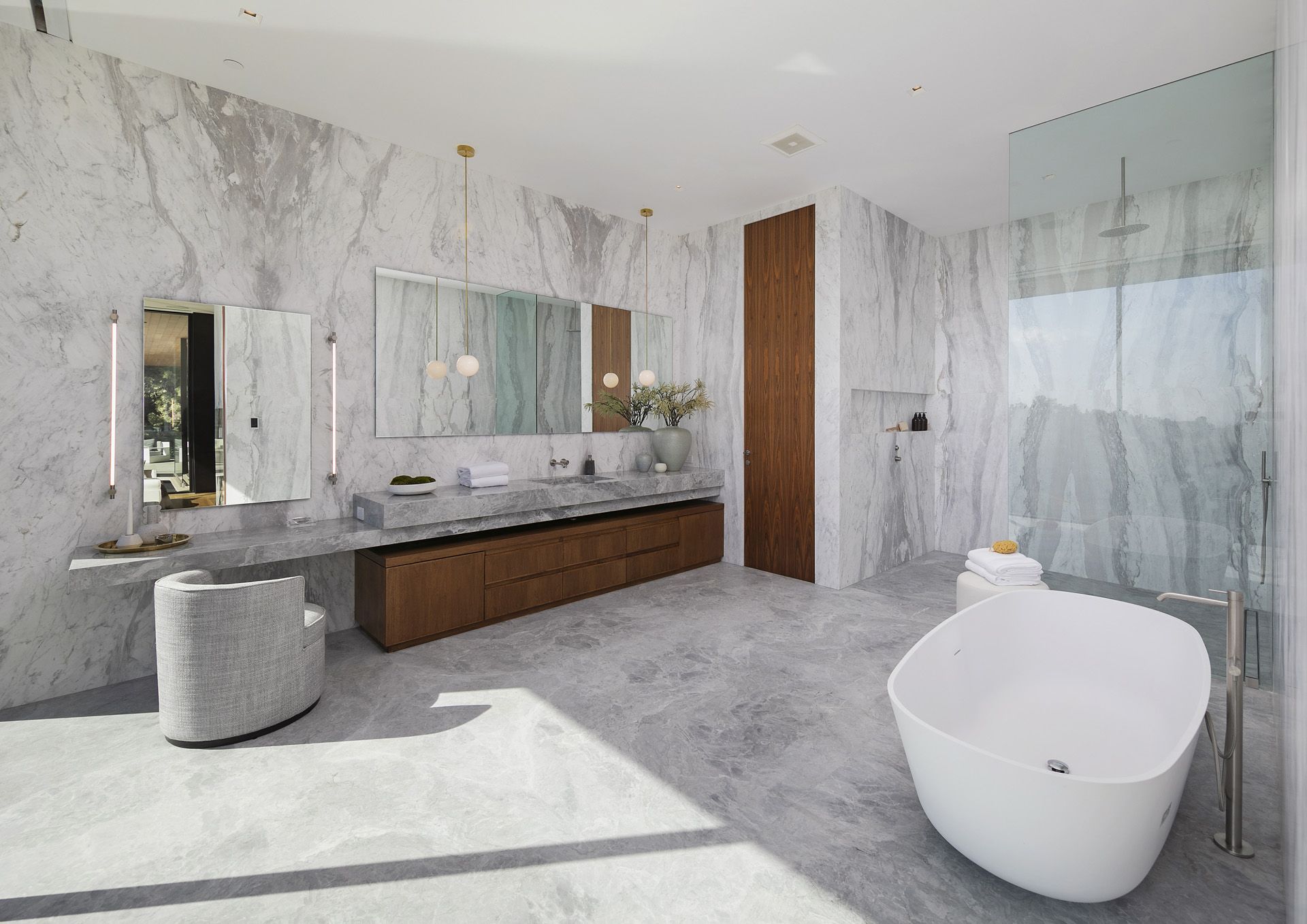 McClean Design always try to capture the spirit of place and they’ve achieved this in a house that they designed in the Bel Air neighborhood to the north of Sunset Boulevard in west Los Angeles. Impressive gates mark the boundaries of this coveted residential estate laid out a century ago by Alphonzo Bell, a farmer who struck oil, bought a ranch in the foothills of the Santa Monica Mountains and developed it with a respect for the topography that is rare today. The lots are large, many of the houses are hidden by lush landscaping from the steep, winding streets, and the site of Perugia is surrounded by trees. The challenge for the architects was to preserve this bosky setting while giving the living areas and the upper-level bedrooms sweeping views over the distant lights of the city. To achieve a balance of openness and enclosure, the garage and motor court are pushed to the rear, and the gym, entertainment and wellness areas occupy a naturally lit basement that opens onto a shady deck. The two upper-level wings are cranked to exploit the views, much as a flower inclines its head towards the sun. That imparts a dynamic quality to the geometry of the floor and roof planes, and to the flow of space within. The angularity is softened by the water wall that flanks the gently curved drive and the shallow pools that refract light into a three-story glass staircase to the north and the living areas to the south. The double-height entry leads into the kitchen-breakfast room and a formal dining room to the other side. A library, family room and guest bedroom extend east from the spacious living area, and most of these areas open through pocketing sliders to a broad pool terrace. The staircase leads up to a primary suite that is as expansive and well-appointed as an apartment. A hallway links four guest bedrooms that share an outdoor terrace, and together they form a sharply angled wing extending over the garage. Travertine cladding, marble floors and rich tones of wood enrich the character of this airy, generously proportioned house and its understated furnishings. Everywhere, the sharp edges of the steel beams that support long spans and shady canopies play off the soft fronds of foliage in a harmonious juxtaposition of construction and nature.