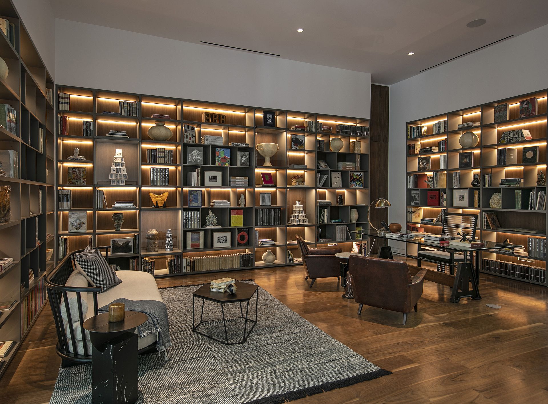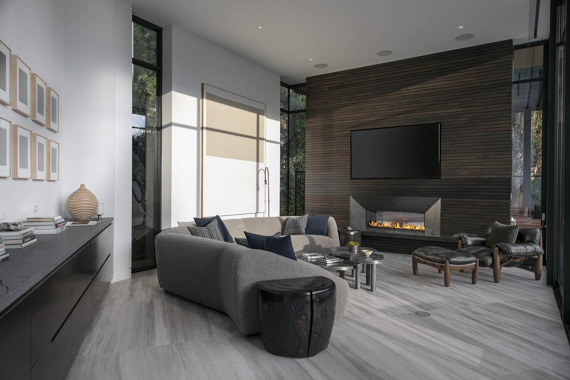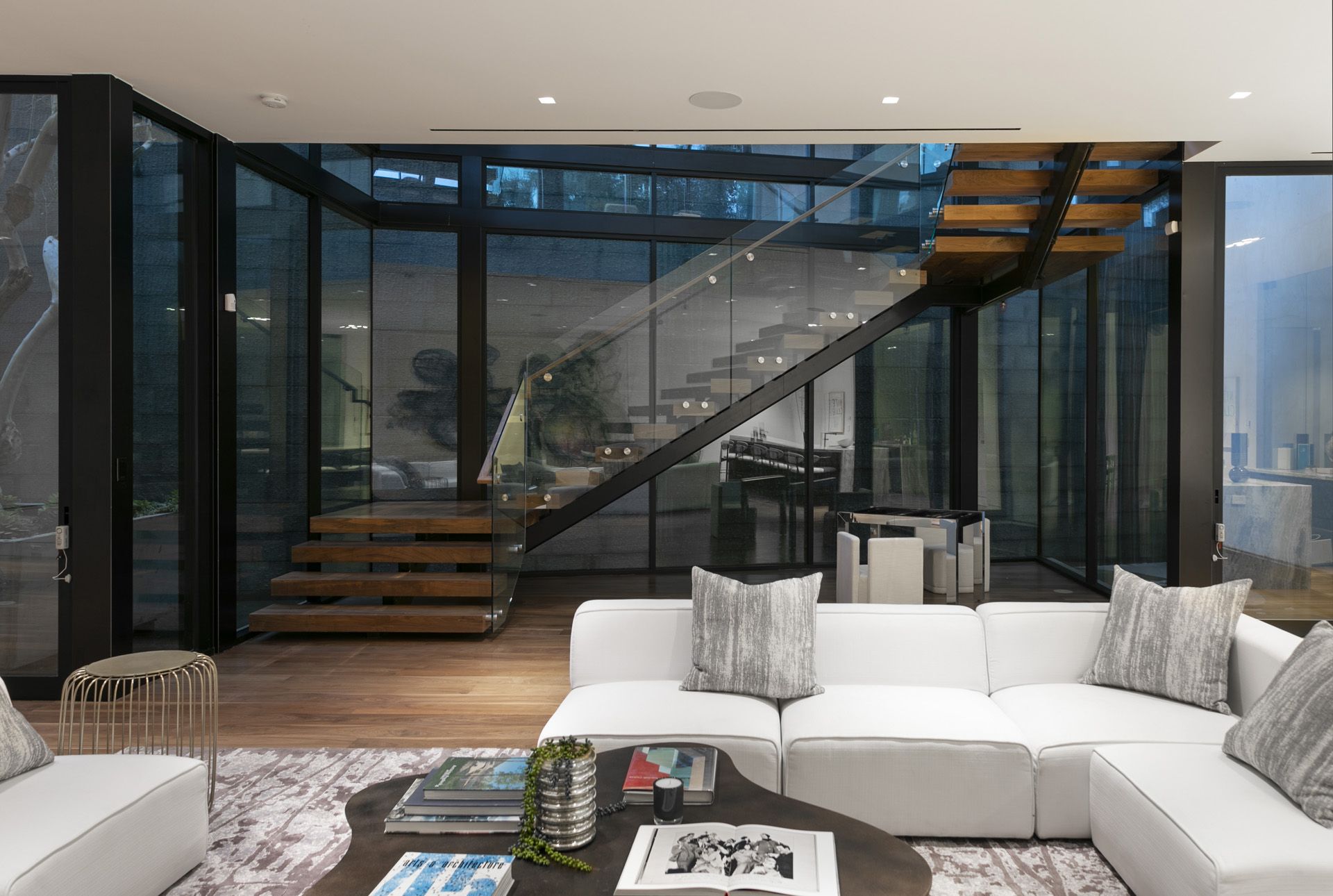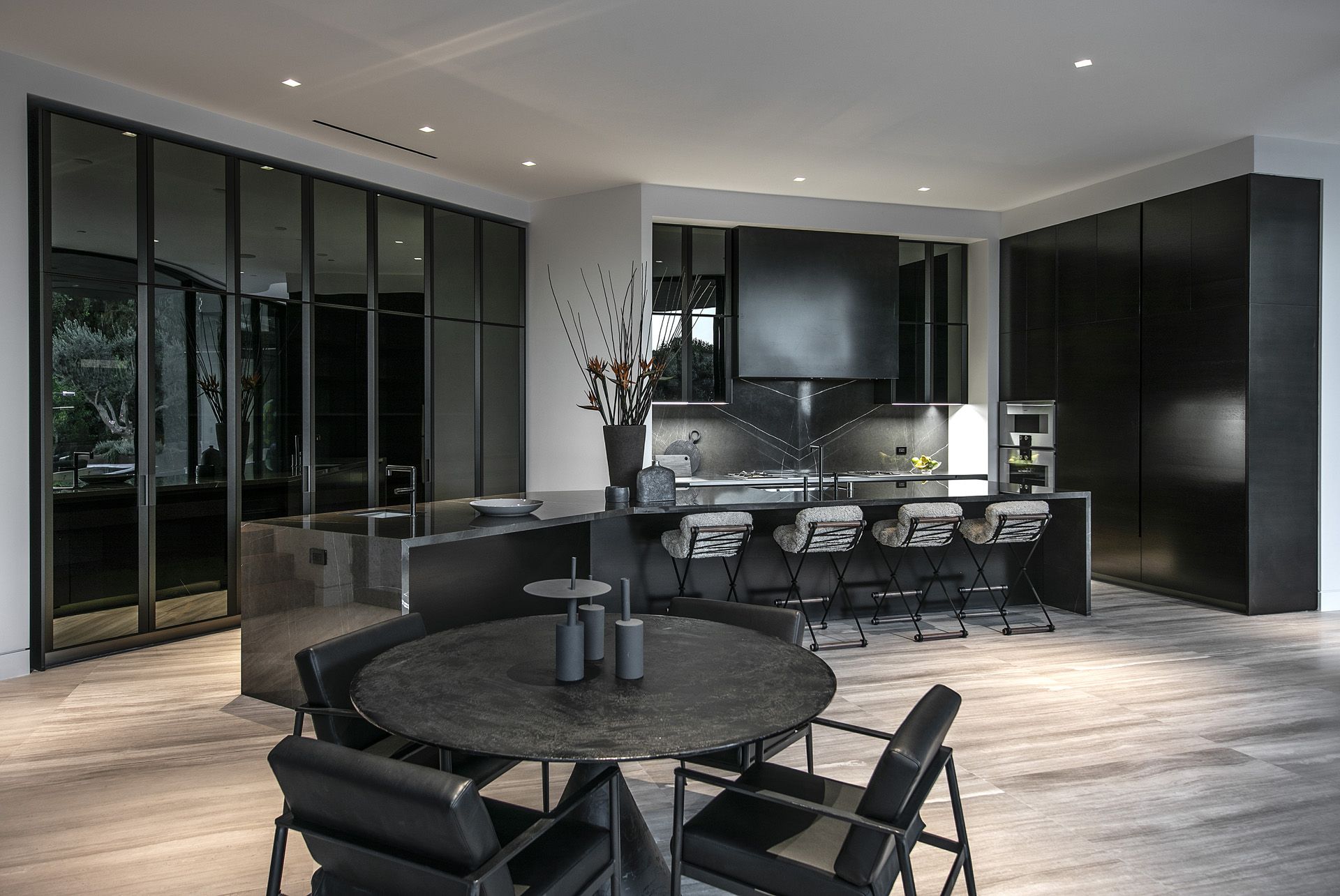 McClean Design always try to capture the spirit of place and they’ve achieved this in a house that they designed in the Bel Air neighborhood to the north of Sunset Boulevard in west Los Angeles. Impressive gates mark the boundaries of this coveted residential estate laid out a century ago by Alphonzo Bell, a farmer who struck oil, bought a ranch in the foothills of the Santa Monica Mountains and developed it with a respect for the topography that is rare today. The lots are large, many of the houses are hidden by lush landscaping from the steep, winding streets, and the site of Perugia is surrounded by trees. The challenge for the architects was to preserve this bosky setting while giving the living areas and the upper-level bedrooms sweeping views over the distant lights of the city. To achieve a balance of openness and enclosure, the garage and motor court are pushed to the rear, and the gym, entertainment and wellness areas occupy a naturally lit basement that opens onto a shady deck. The two upper-level wings are cranked to exploit the views, much as a flower inclines its head towards the sun. That imparts a dynamic quality to the geometry of the floor and roof planes, and to the flow of space within. The angularity is softened by the water wall that flanks the gently curved drive and the shallow pools that refract light into a three-story glass staircase to the north and the living areas to the south. The double-height entry leads into the kitchen-breakfast room and a formal dining room to the other side. A library, family room and guest bedroom extend east from the spacious living area, and most of these areas open through pocketing sliders to a broad pool terrace. The staircase leads up to a primary suite that is as expansive and well-appointed as an apartment. A hallway links four guest bedrooms that share an outdoor terrace, and together they form a sharply angled wing extending over the garage. Travertine cladding, marble floors and rich tones of wood enrich the character of this airy, generously proportioned house and its understated furnishings. Everywhere, the sharp edges of the steel beams that support long spans and shady canopies play off the soft fronds of foliage in a harmonious juxtaposition of construction and nature.