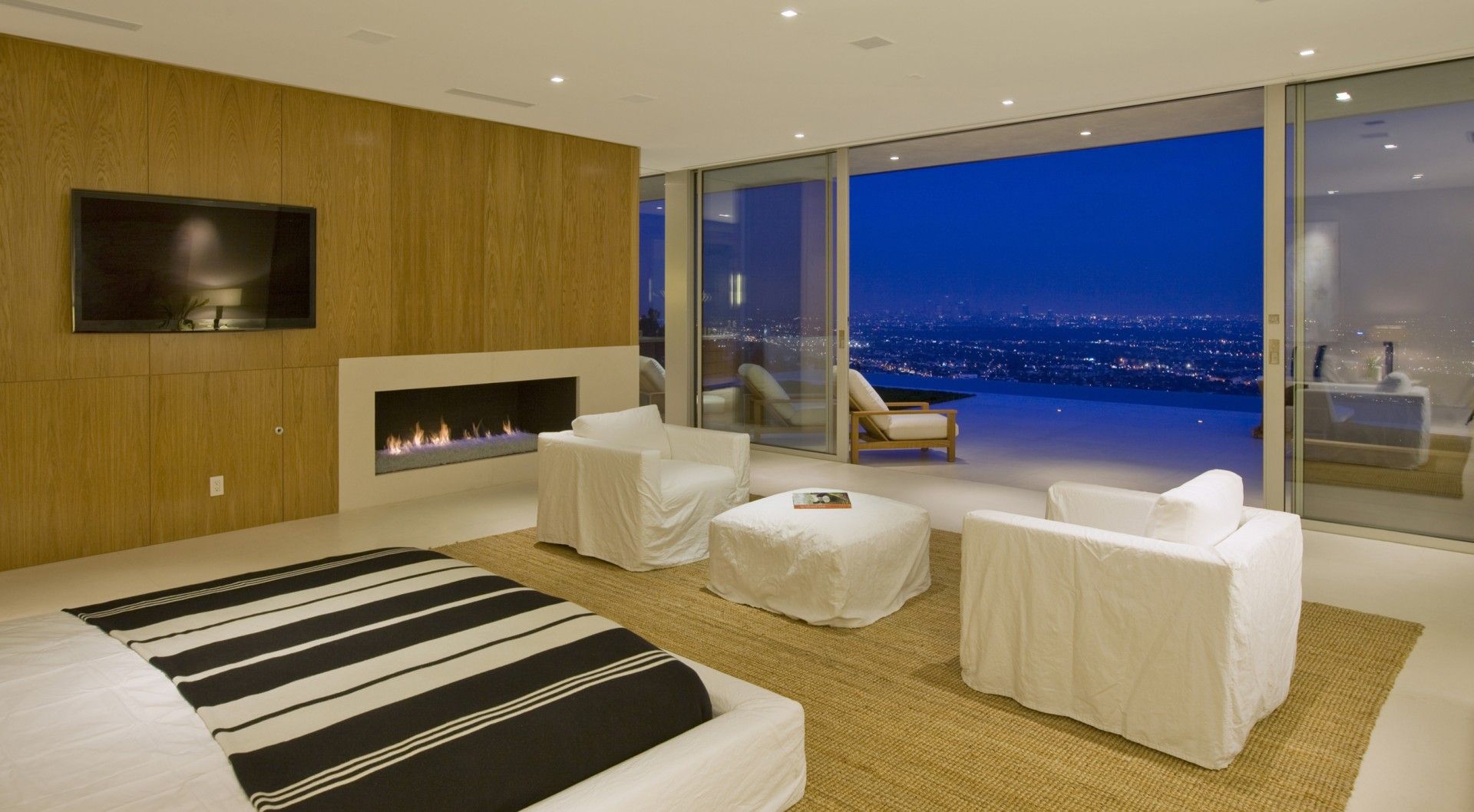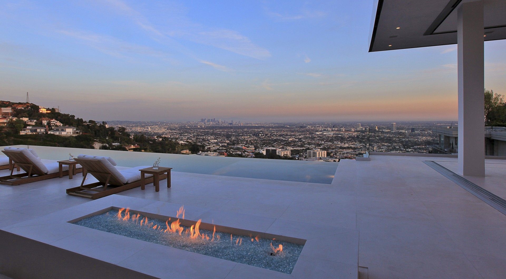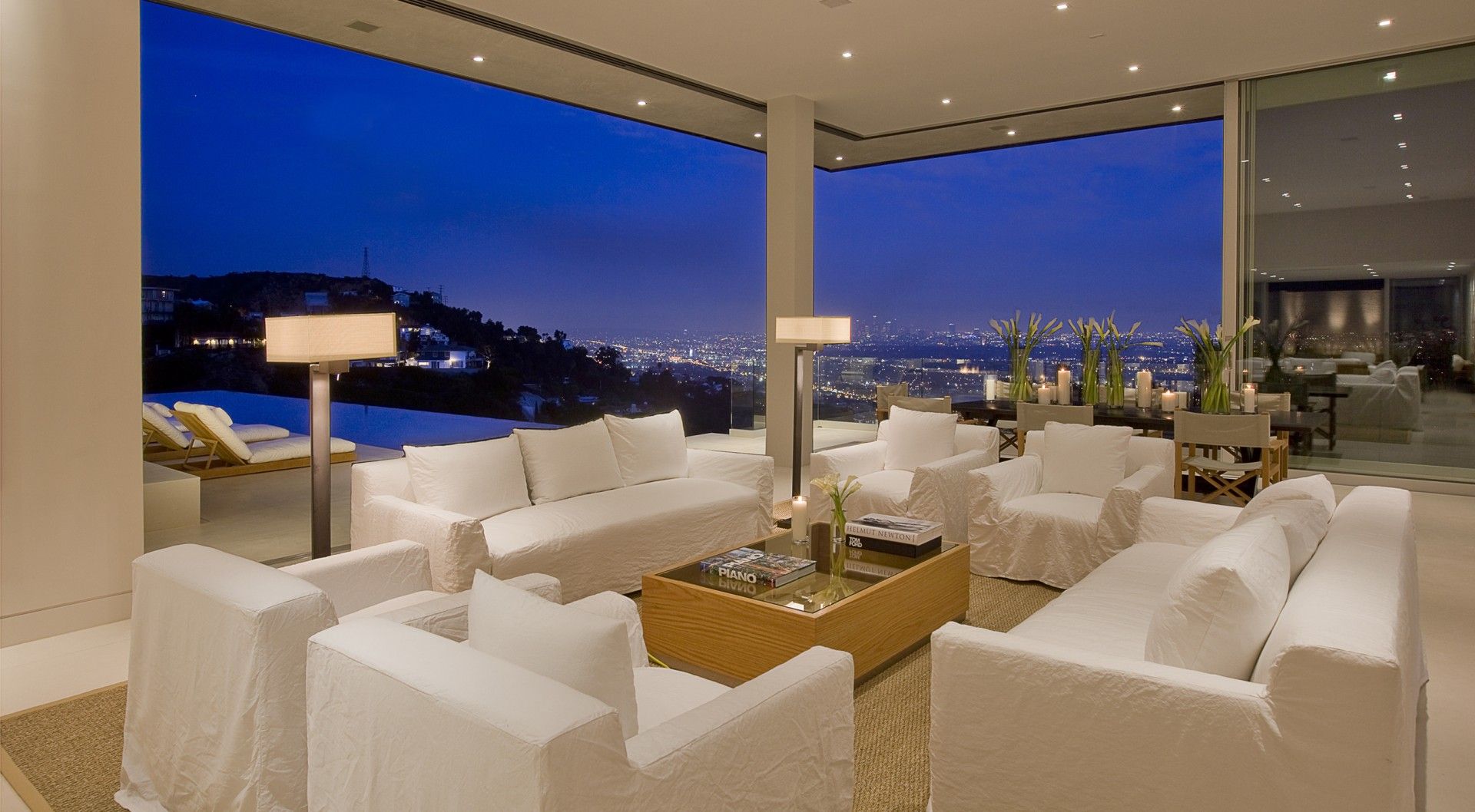 The new residence is a remodel of an existing home that was designed in the French style during the 1970s and was in very bad shape. The existing house was stripped down to framing and rebuilt in a contemporary style to take advantage of the magnificent views over the city of Los Angeles below. Both the house and pool are shaped in configuration. Central to our concept for the house was to remove the existing pool which was located in the middle of the yard and push out a new pool to the extremities of the lot to produce a larger outdoor living space wrapped by the house and the infinity pool. Ceiling heights were increased in the main living areas and the plan opened up to visually connect the different spaces. A key element of the design is the transparent sliding door systems which open the interior up to the outdoors and the view. The house is laid out on one level, something of a rarity in the Hollywood Hills, and consists of three bedrooms, living, dining, kitchen and family rooms, as well as a small screening room and gym. We kept the palette of materials extremely simple using white limestone, brushed aluminum and stainless steel warmed by oak walls and cabinetry.