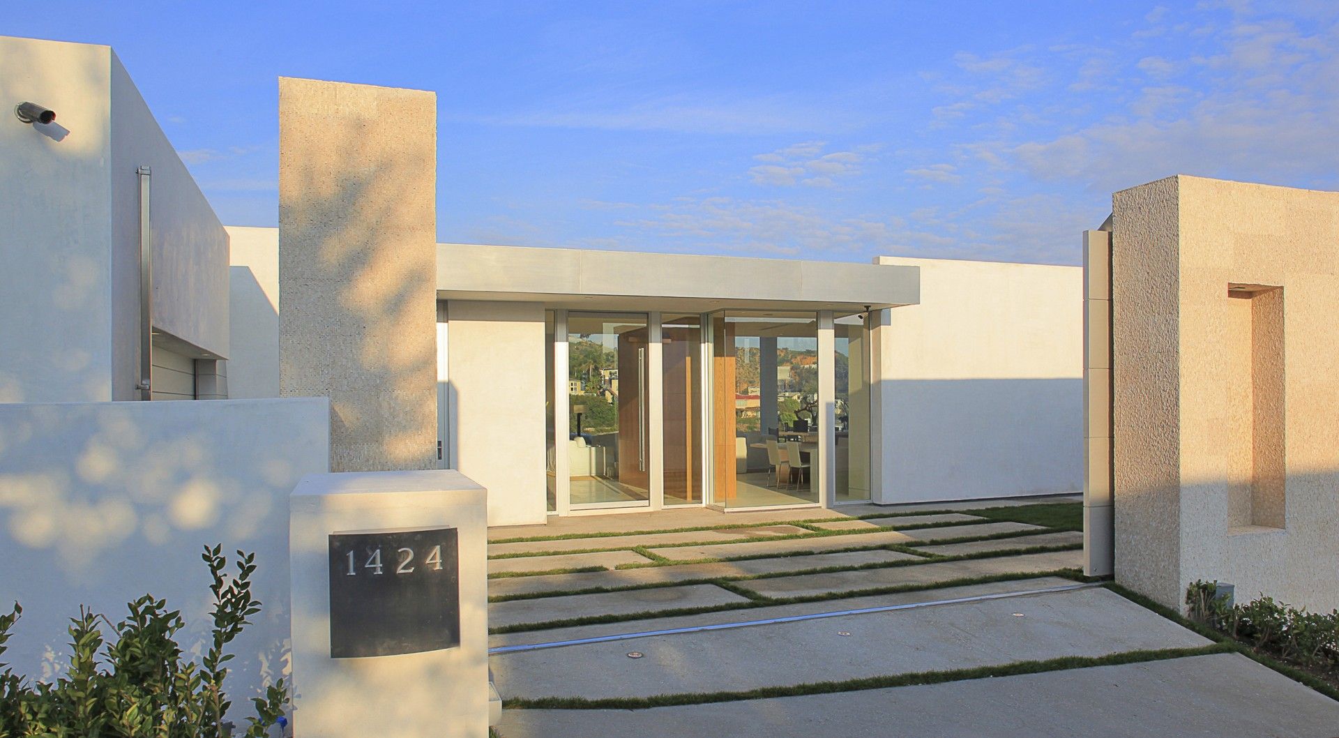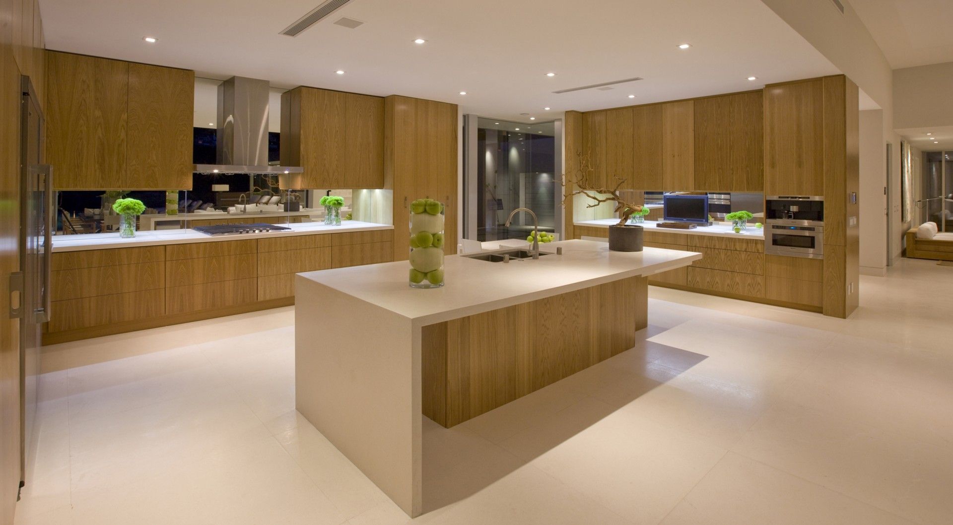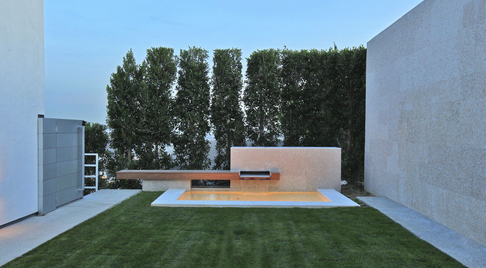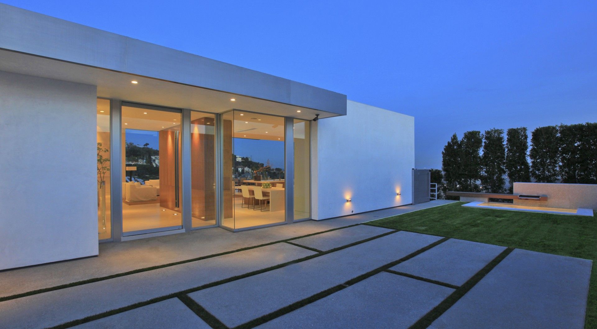 The new residence is a remodel of an existing home that was designed in the French style during the 1970s and was in very bad shape. The existing house was stripped down to framing and rebuilt in a contemporary style to take advantage of the magnificent views over the city of Los Angeles below. Both the house and pool are shaped in configuration. Central to our concept for the house was to remove the existing pool which was located in the middle of the yard and push out a new pool to the extremities of the lot to produce a larger outdoor living space wrapped by the house and the infinity pool. Ceiling heights were increased in the main living areas and the plan opened up to visually connect the different spaces. A key element of the design is the transparent sliding door systems which open the interior up to the outdoors and the view. The house is laid out on one level, something of a rarity in the Hollywood Hills, and consists of three bedrooms, living, dining, kitchen and family rooms, as well as a small screening room and gym. We kept the palette of materials extremely simple using white limestone, brushed aluminum and stainless steel warmed by oak walls and cabinetry.