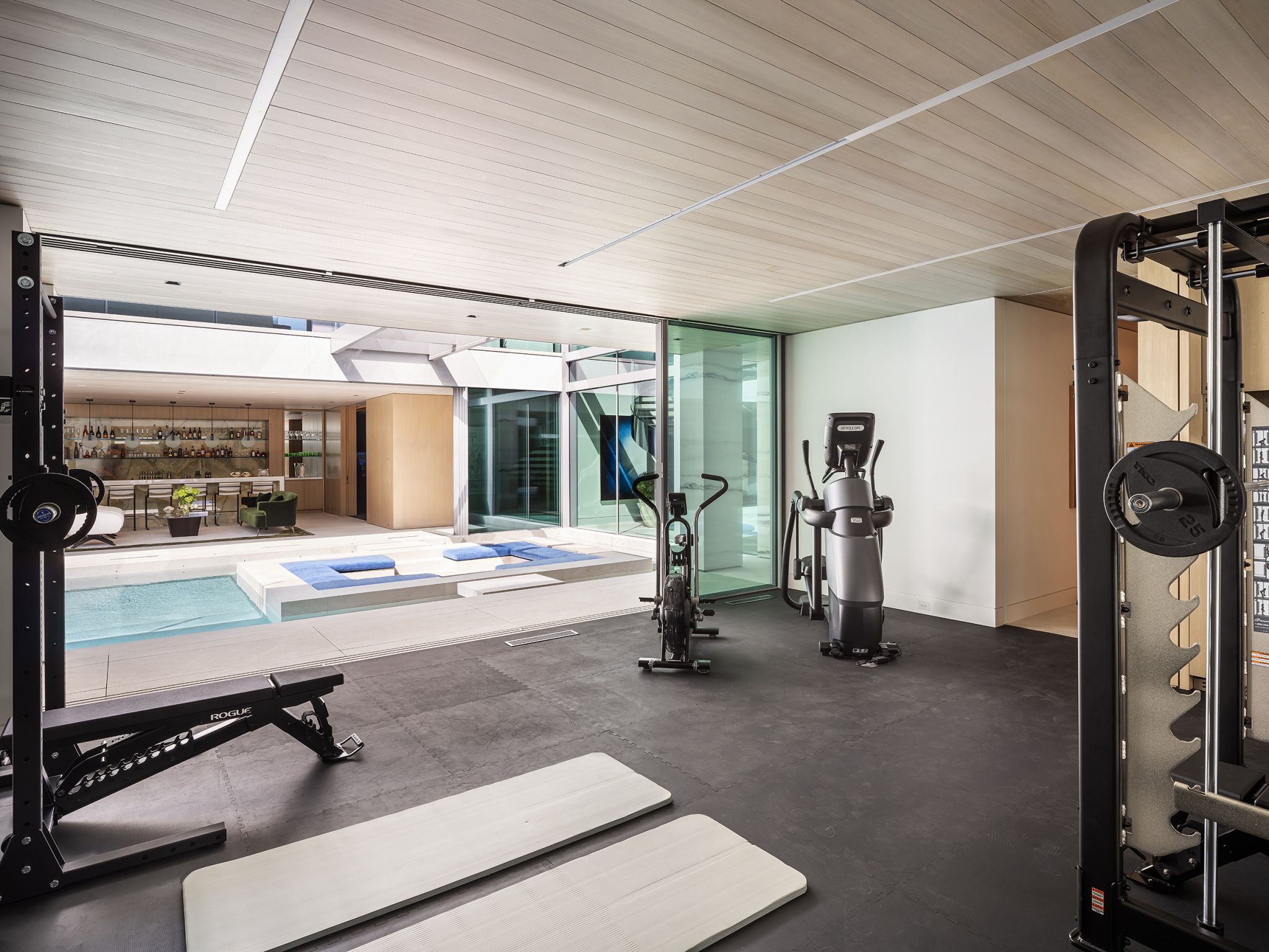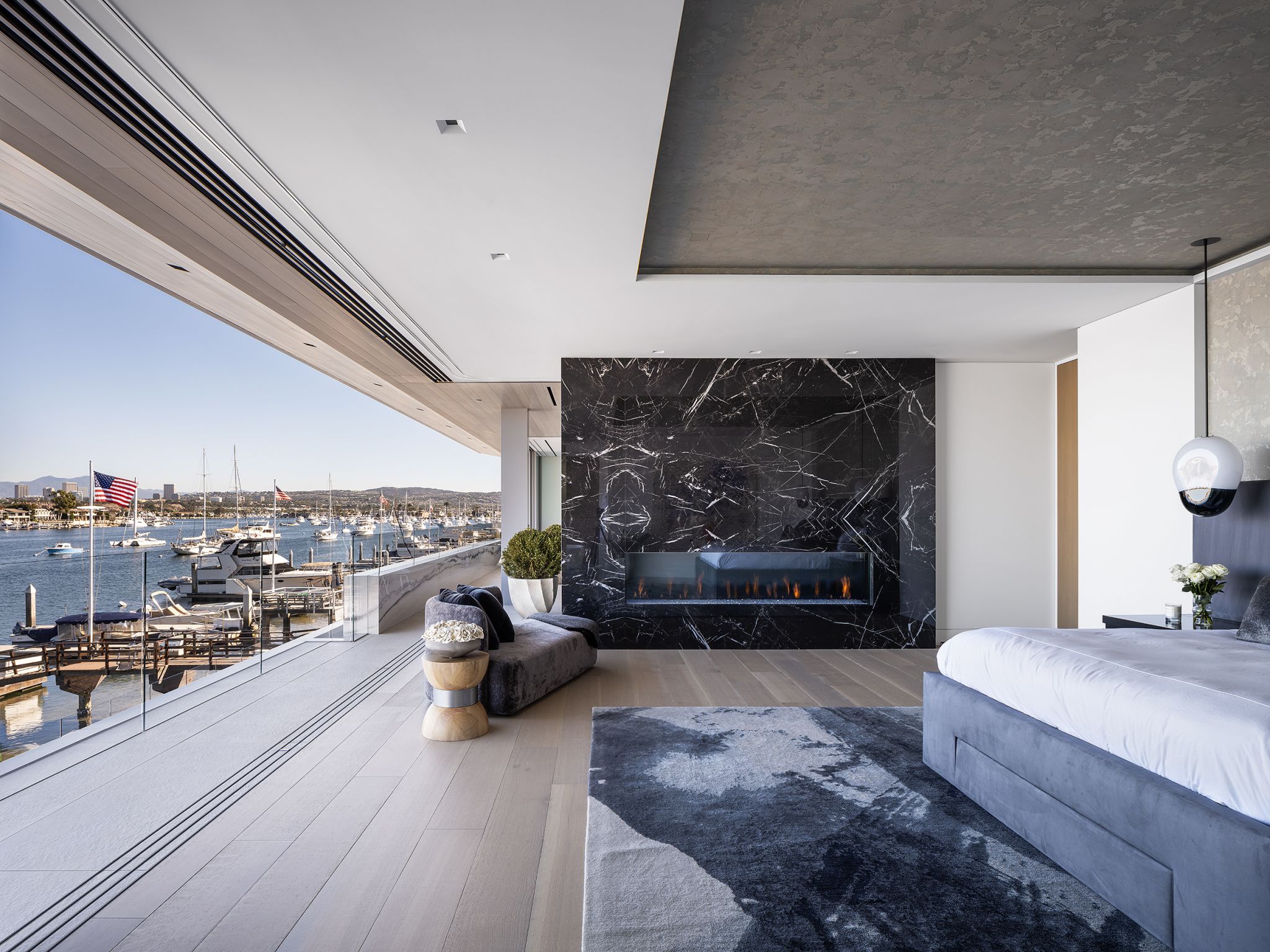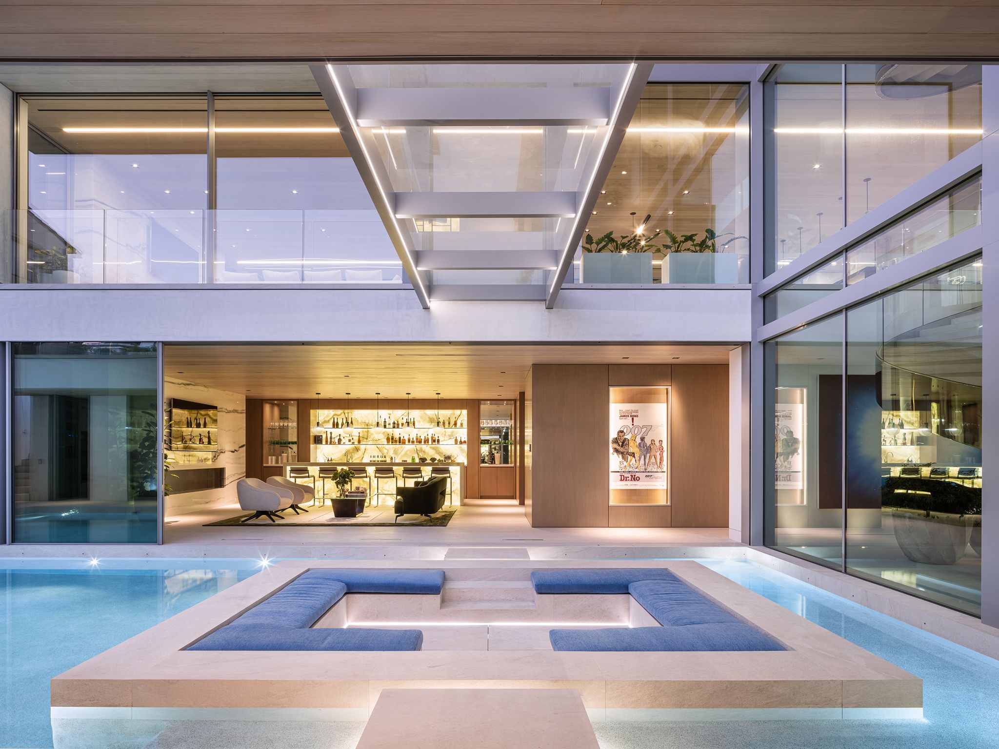 A glass bridge floats over the lower-level pool, leading into the great room that spans the full width of the home. Pocketing sliders open the space entirely to a covered patio with a fireplace and spa, making it usable year-round. Below, a sea-level terrace invites guests to linger on the water’s edge. Light reflects off surfaces—glass, water, stone—constantly shifting with the sun and sea.