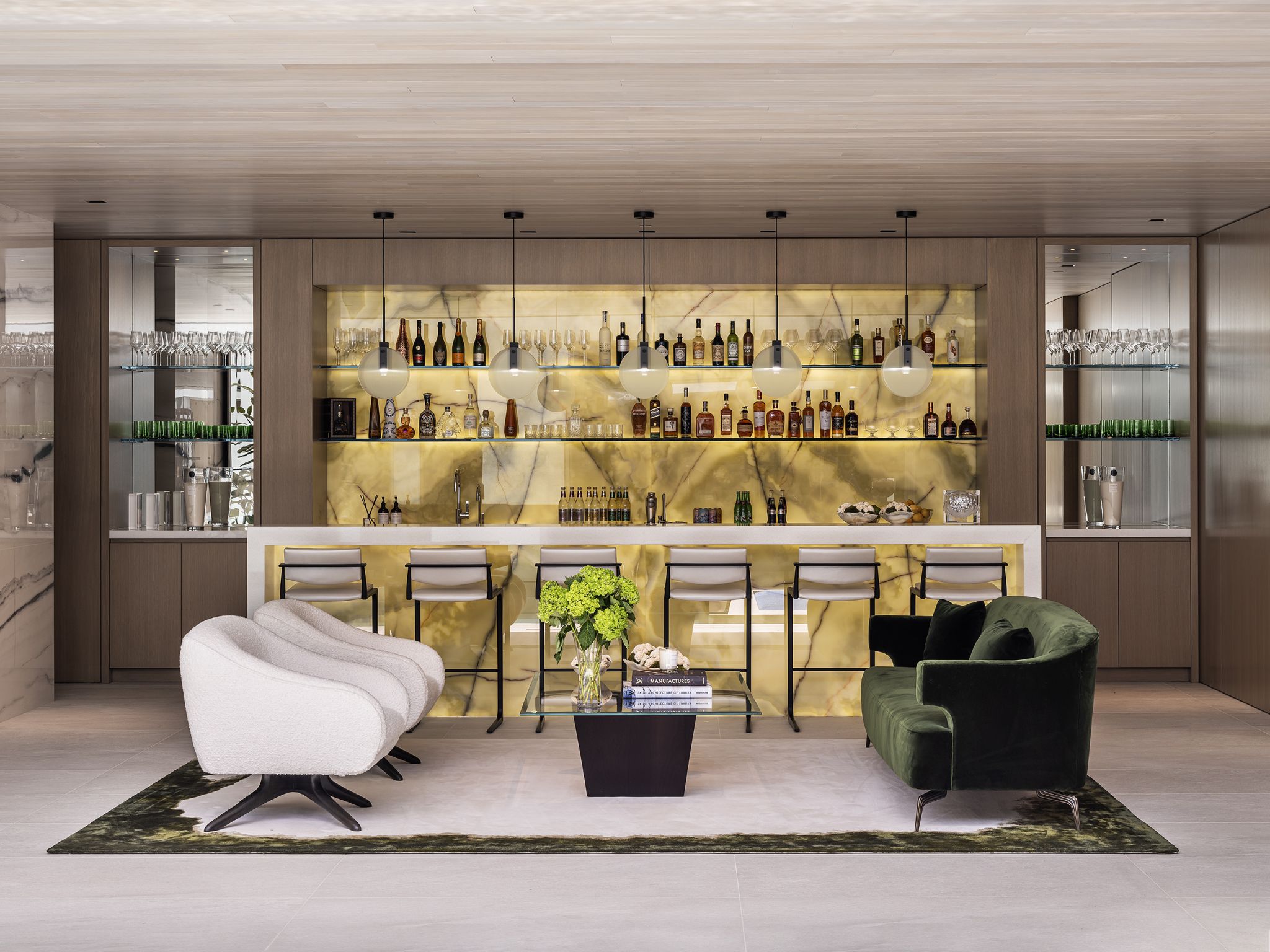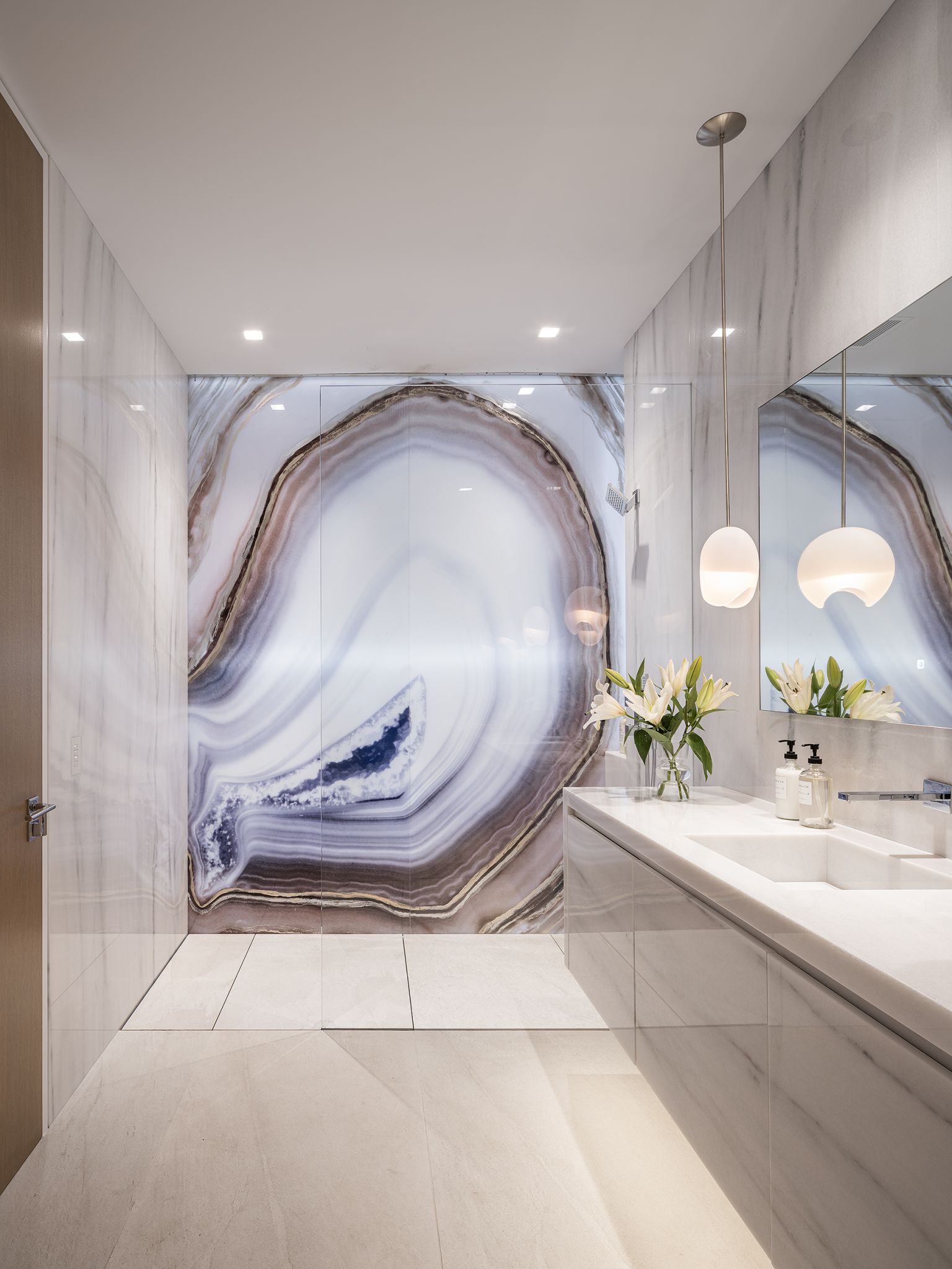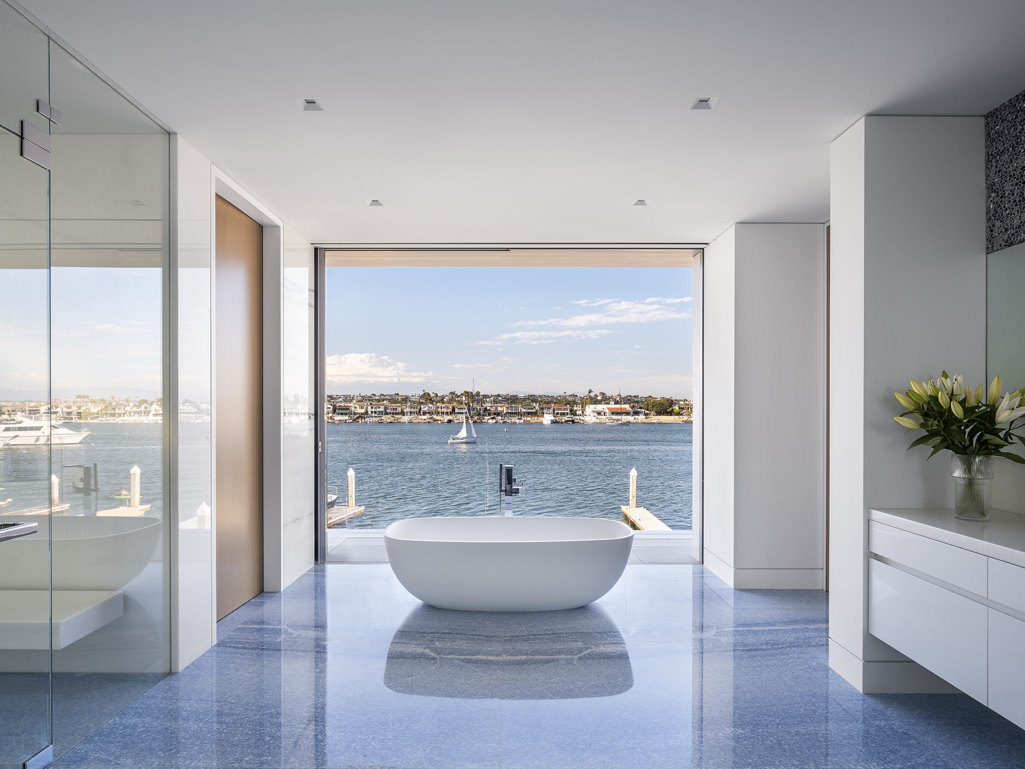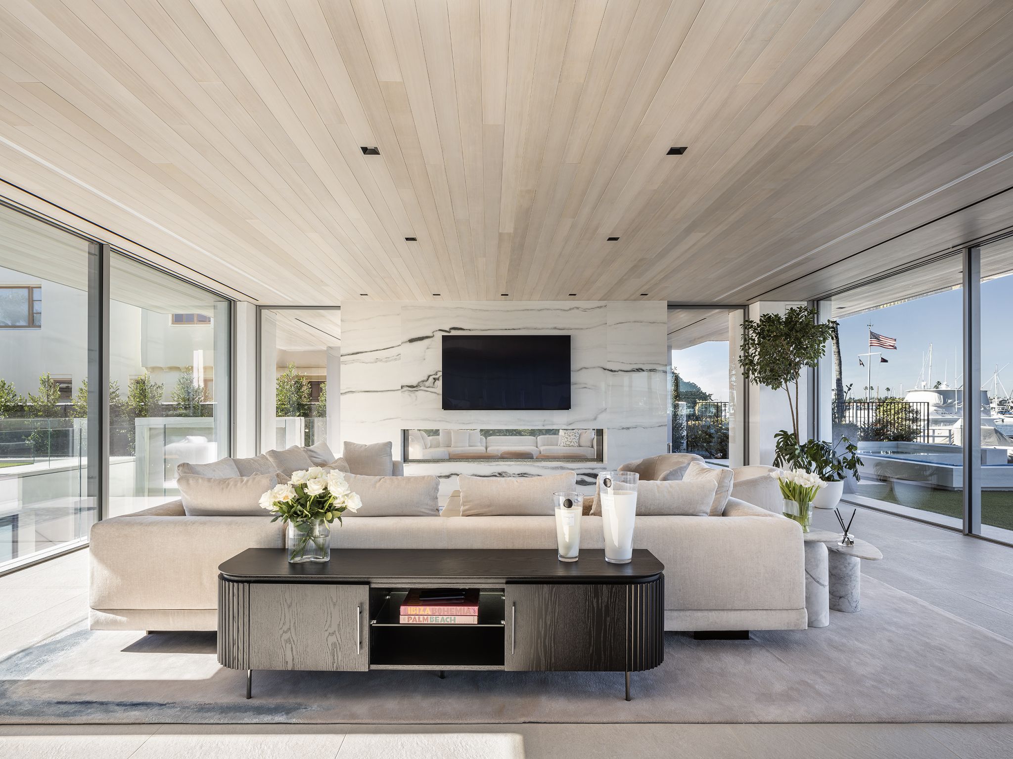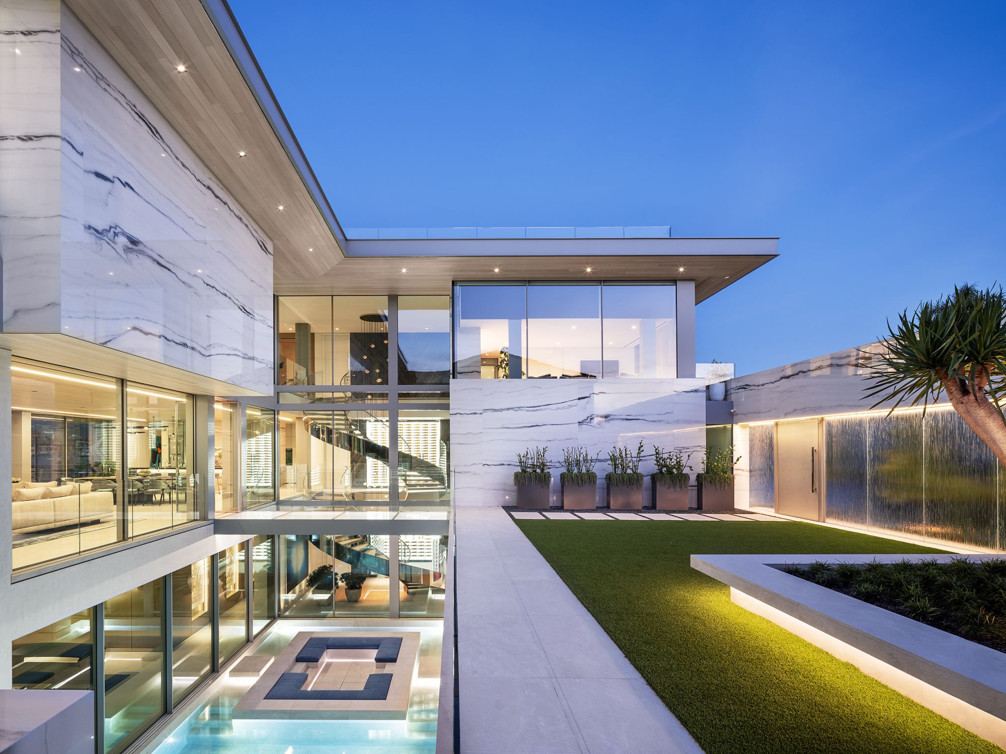 Much of the house’s exterior is clad in bold, veined white marble—visually striking and resistant to the salt-laden coastal air. The same marble flows inside, creating continuity between interior and exterior. Luxurious touches punctuate the palette, including an onyx wall in a powder room. From the gate, one can see through the glass façade straight to the marina, as if the house itself is transparent to the view.