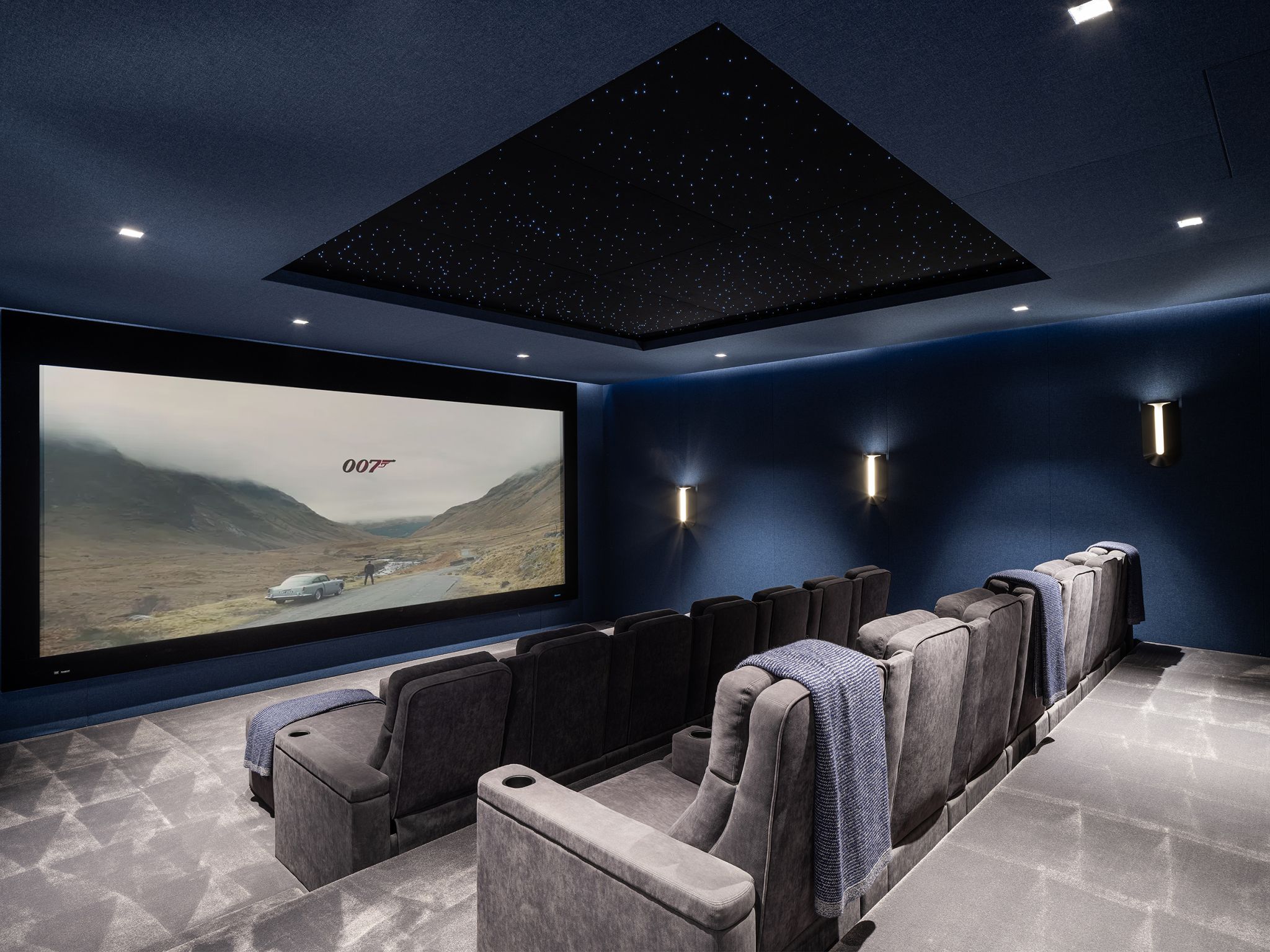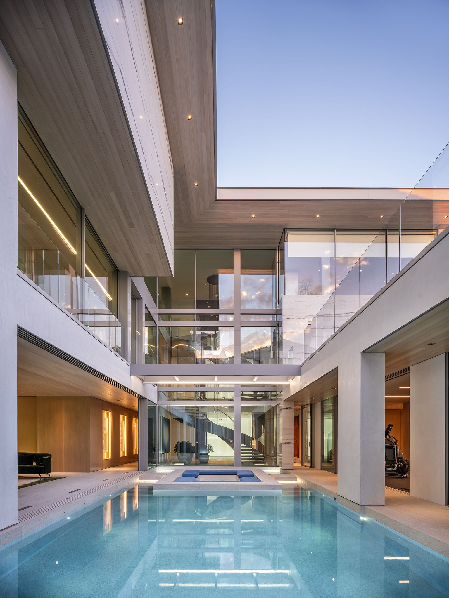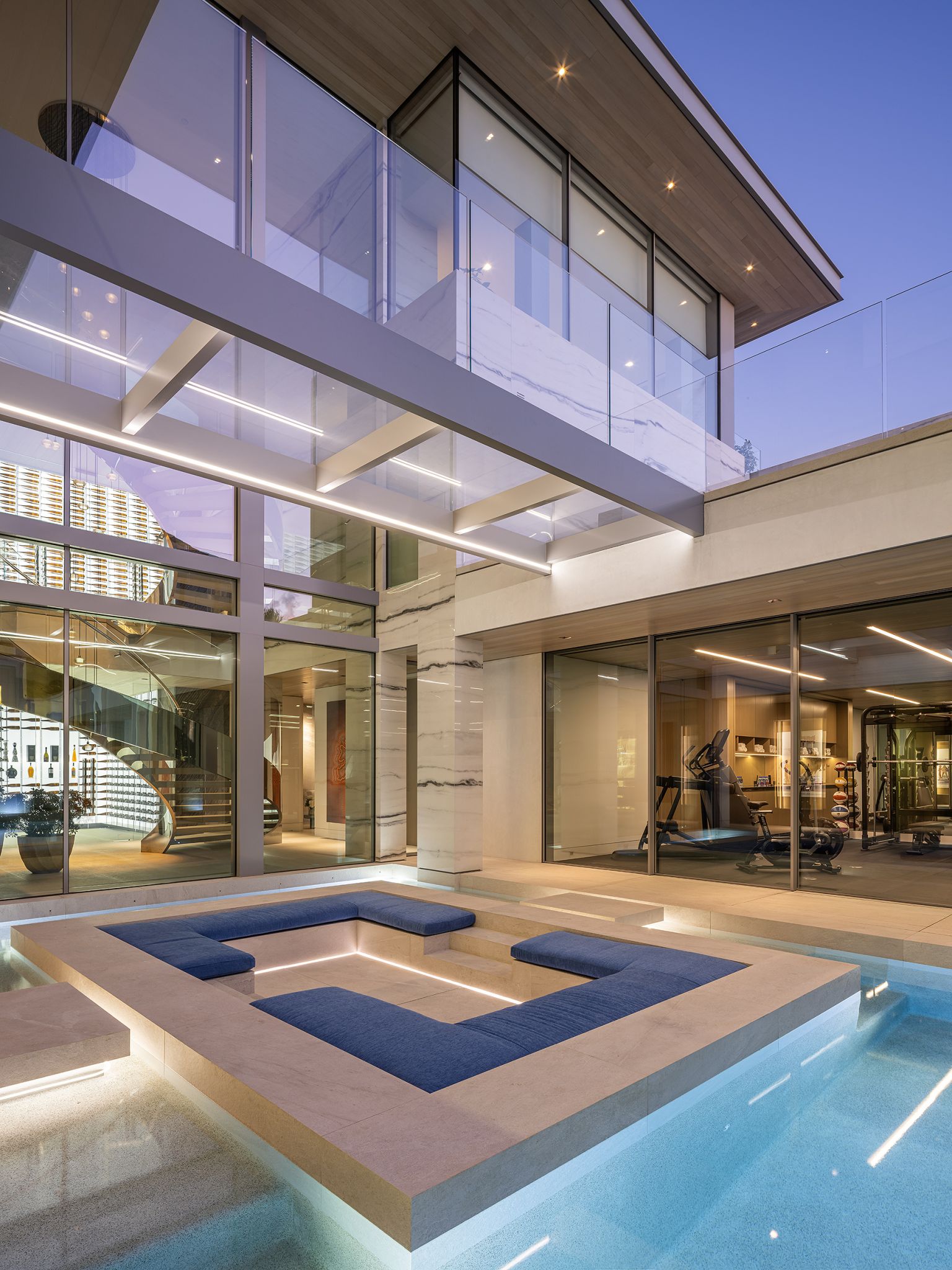 The spirit of hedonism also flourishes on the lower level, in the pool with its water wall and padded seating alcove, in the sauna and driving simulator, and in a theater that any Hollywood producer would covet. Two guest bedrooms and a gym open onto the pool. No wonder invitations to this house are prized.