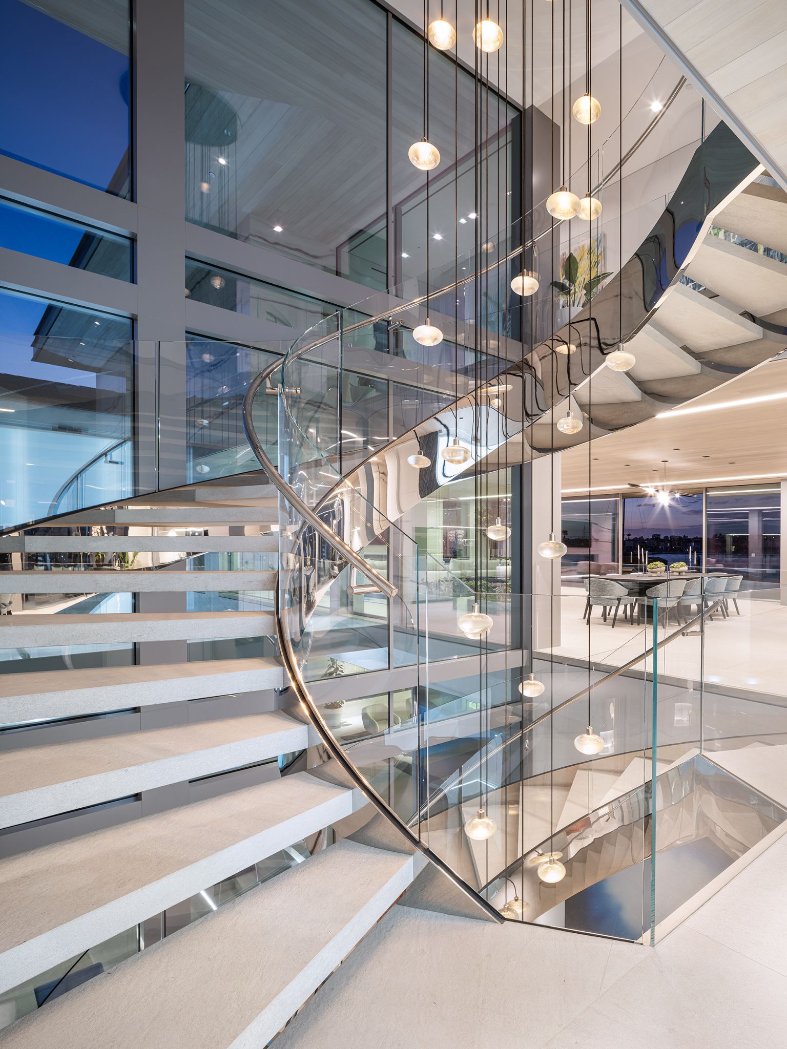 A stainless steel spiral staircase with limestone treads links the three levels and sparkles in the light of suspended globes. From here you can get a sense of the whole house, front to back and vertically.